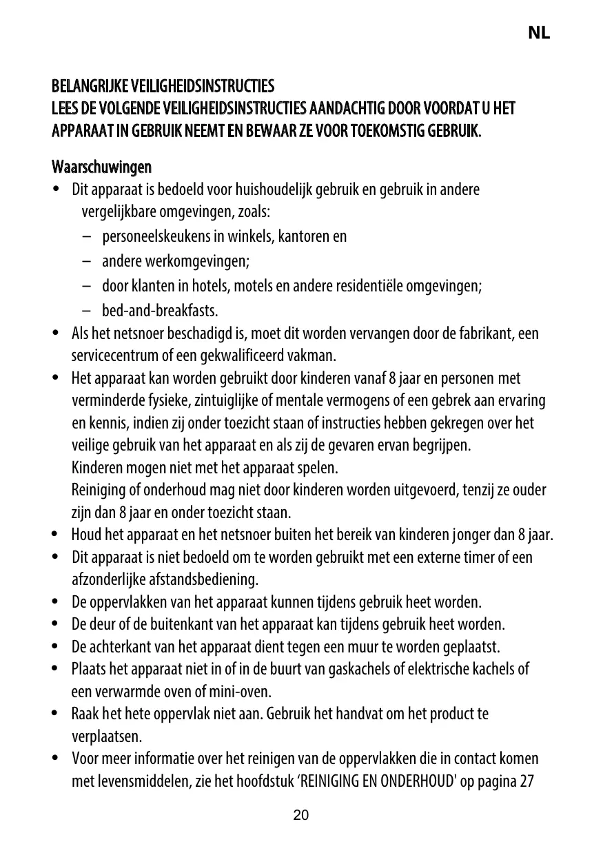 ࢼ les fermes; ࢼ l’utilisation par les clients des hôtels, motels et autres environnements à caractère résidentiel; ࢼ les environnements de type chambre d’hôtes. y Si le câble d'alimentation est endommagé, il doit être remplacé par le fabricant, son service après vente ou des personnes de qualification similaire afin d'éviter un danger. y Cet appareil peut être utilisé par des enfants à partir de 8 ans et plus et par des personnes ayant des capacités physiques, sensorielles ou mentales réduites ou un manque d’expérience et de connaissances à condition qu’elles aient reçu une supervision ou des instructions concernant l’utilisation de l’appareil en toute sécurité et qu’elles comprennent les dangers encourus. Les enfants ne doivent pas jouer avec l’appareil. Le nettoyage et l’entretien par l’usager ne doivent pas être effectués par des enfants, sauf s’ils ont plus de 8 ans et qu’ils sont surveillés. y Maintenir l’appareil et son cordon hors de portée des enfants de moins de 8 ans. y Cet appareil n’est pas destiné à être mis en fonctionnement au moyen d'une minuterie extérieure ou par un système de commande à distance séparé. y La température des surfaces accessibles peut être élevée lorsque l'appareil est en fonctionnement. y La porte ou la surface extérieure peut devenir chaude lorsque l'appareil fonctionne. y L’arrière de l’appareil doit être placé contre un mur. y Ne pas placer l’appareil près de ou sur une gazinière ou une plaque chauffante, ne le posez pas sur un four ou un mini-four.