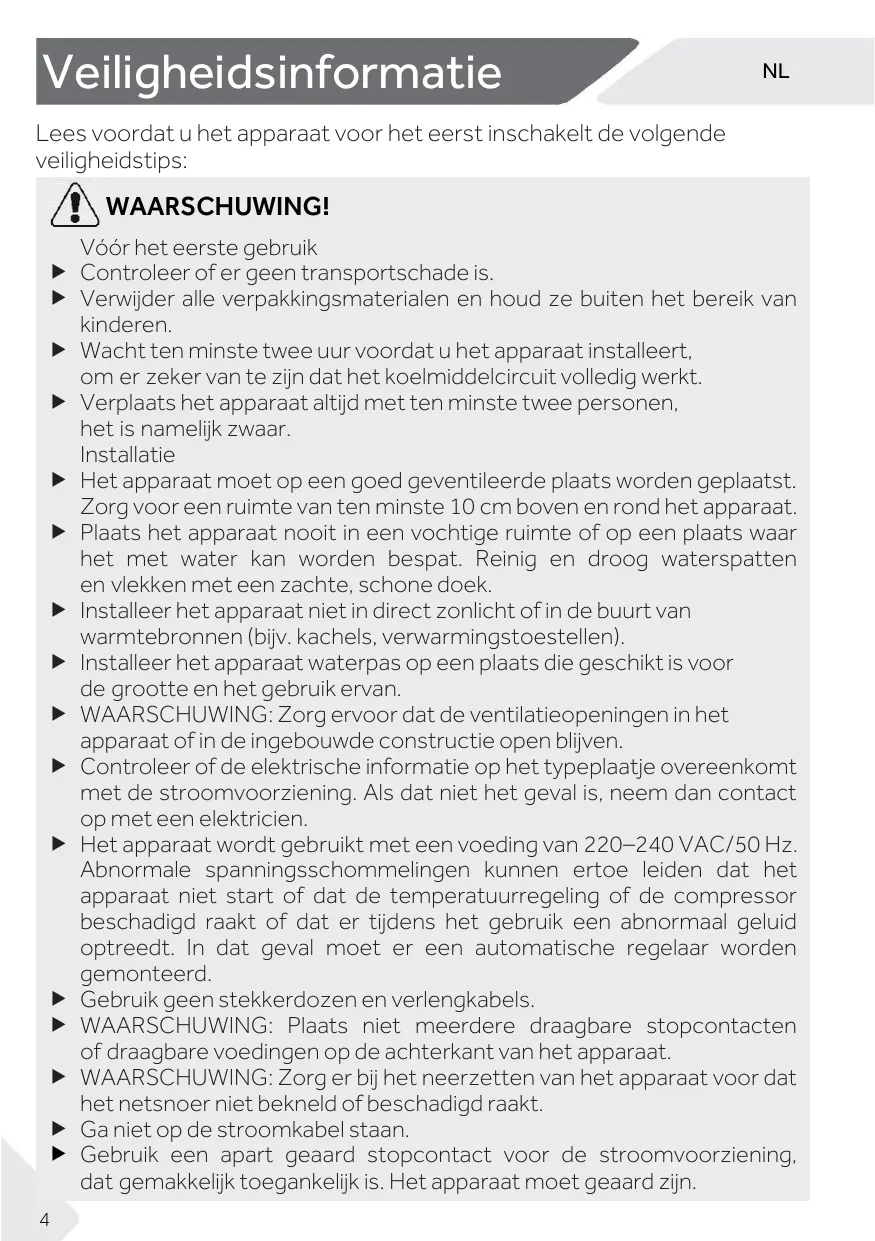 Attendez au moins deux heures avant d’installer l’appareil afin de vous assurer que le circuit réfrigérant fonctionne parfaitement. Manipulez toujours l’appareil avec au moins deux personnes parce qu’il est lourd. Installation L’appareil doit être placé dans un endroit bien ventilé. Garantissez un espace d’au moins 10 cm au-dessus et autour de l’appareil. Ne placez jamais l’appareil dans un endroit humide ou un endroit où il pourrait être éclaboussé d’eau. Nettoyez et séchez les éclaboussures d’eau et les taches avec un chiffon doux et propre. N’installez pas l’appareil en plein soleil ou à proximité de sources de chaleur (par ex. cuisinières, chauffages). Installez et mettez à niveau l’appareil dans une zone adaptée à sa taille et à son utilisation. AVERTISSEMENT : Maintenez les ouvertures de ventilation situées dans l’appareil ou dans la structure encastrée libres de toute obstruction. Assurez-vous que les informations électriques figurant sur la plaque signalétique sont conformes à l’alimentation électrique. Si ce n’est pas le cas, contactez un électricien. L’appareil est alimenté par une alimentation de 220-240 VCA/50 Hz. Les variations anormales de tension peuvent provoquer l’arrêt de l’appareil ou endommager le régulateur de température ou le compresseur, ou il peut y avoir un bruit anormal lors du fonctionnement. Dans ce cas, un régulateur automatique doit être monté. N’utilisez pas d’adaptateurs multiprises ni de rallonges. AVERTISSEMENT : Ne placez pas de systèmes multiprises portatifs ou d’alimentations portatives à l’arrière de l’appareil. AVERTISSEMENT : Lors du positionnement de l’appareil, vérifiez que le cordon d’alimentation n’est pas coincé ou abîmé. Ne marchez pas sur le câble d’alimentation. Utilisez une prise de terre séparée pour l’alimentation électrique qui soit facile d’accès. L’appareil doit être mis à la terre. 4