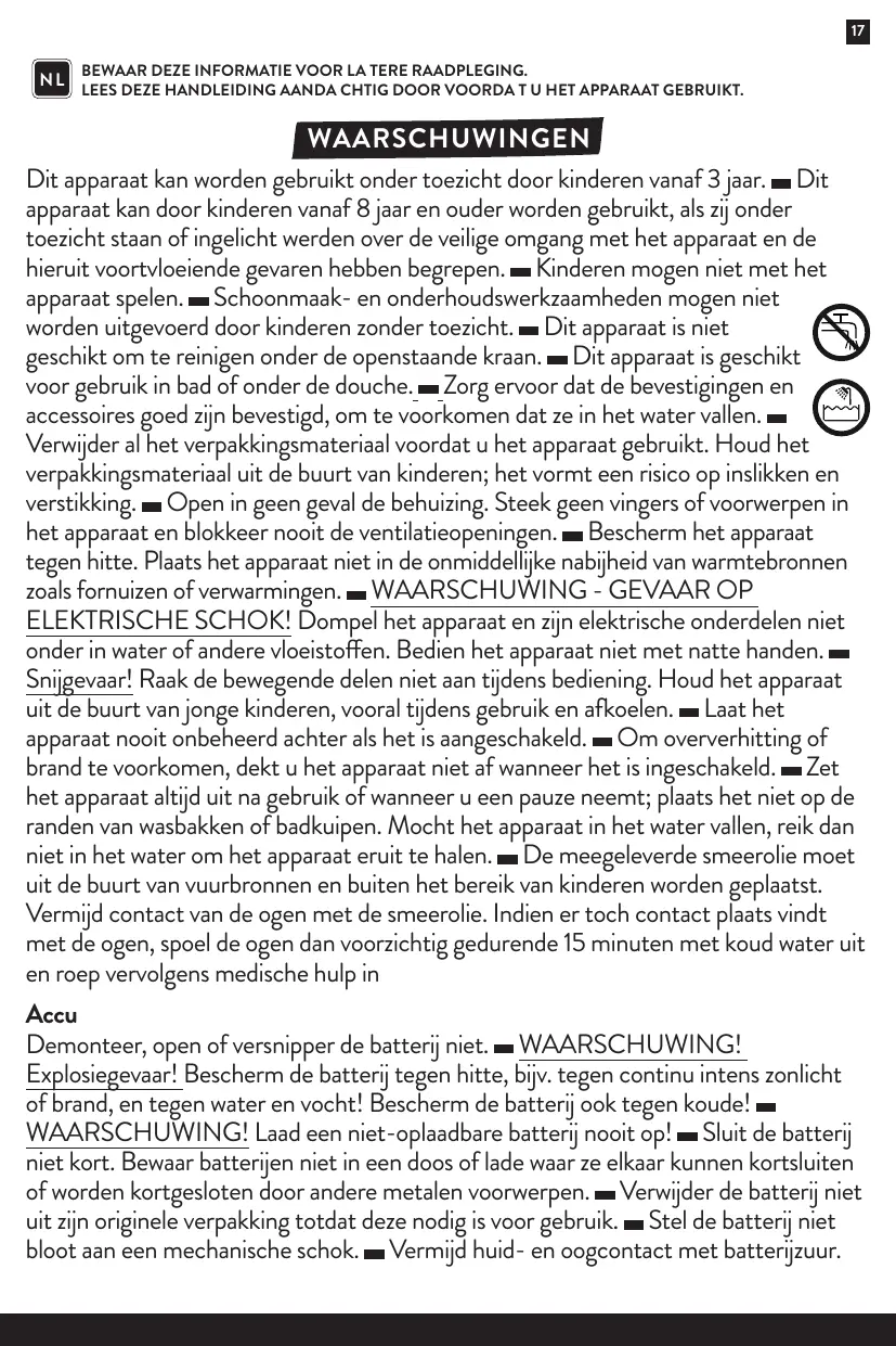 WAARSCHUWINGEN Dit apparaat kan worden gebruikt onder toezicht door kinderen vanaf 3 jaar. Dit apparaat kan door kinderen vanaf 8 jaar en ouder worden gebruikt, als zij onder toezicht staan of ingelicht werden over de veilige omgang met het apparaat en de hieruit voortvloeiende gevaren hebben begrepen. Kinderen mogen niet met het apparaat spelen. Schoonmaak- en onderhoudswerkzaamheden mogen niet worden uitgevoerd door kinderen zonder toezicht. Dit apparaat is niet geschikt om te reinigen onder de openstaande kraan. Dit apparaat is geschikt voor gebruik in bad of onder de douche. Zorg ervoor dat de bevestigingen en accessoires goed zijn bevestigd, om te voorkomen dat ze in het water vallen. Verwijder al het verpakkingsmateriaal voordat u het apparaat gebruikt. Houd het verpakkingsmateriaal uit de buurt van kinderen; het vormt een risico op inslikken en verstikking. Open in geen geval de behuizing. Steek geen vingers of voorwerpen in het apparaat en blokkeer nooit de ventilatieopeningen. Bescherm het apparaat tegen hitte. Plaats het apparaat niet in de onmiddellijke nabijheid van warmtebronnen zoals fornuizen of verwarmingen. WAARSCHUWING - GEVAAR OP ELEKTRISCHE SCHOK! Dompel het apparaat en zijn elektrische onderdelen niet onder in water of andere vloeistoffen. Bedien het apparaat niet met natte handen. Snijgevaar! Raak de bewegende delen niet aan tijdens bediening. Houd het apparaat uit de buurt van jonge kinderen, vooral tijdens gebruik en afkoelen. Laat het apparaat nooit onbeheerd achter als het is aangeschakeld. Om oververhitting of brand te voorkomen, dekt u het apparaat niet af wanneer het is ingeschakeld. Zet het apparaat altijd uit na gebruik of wanneer u een pauze neemt; plaats het niet op de randen van wasbakken of badkuipen. Mocht het apparaat in het water vallen, reik dan niet in het water om het apparaat eruit te halen. De meegeleverde smeerolie moet uit de buurt van vuurbronnen en buiten het bereik van kinderen worden geplaatst. Vermijd contact van de ogen met de smeerolie. Indien er toch contact plaats vindt met de ogen, spoel de ogen dan voorzichtig gedurende 15 minuten met koud water uit en roep vervolgens medische hulp in Accu Demonteer, open of versnipper de batterij niet. WAARSCHUWING! Explosiegevaar! Bescherm de batterij tegen hitte, bijv. tegen continu intens zonlicht of brand, en tegen water en vocht! Bescherm de batterij ook tegen koude! WAARSCHUWING! Laad een niet-oplaadbare batterij nooit op! Sluit de batterij niet kort. Bewaar batterijen niet in een doos of lade waar ze elkaar kunnen kortsluiten of worden kortgesloten door andere metalen voorwerpen. Verwijder de batterij niet uit zijn originele verpakking totdat deze nodig is voor gebruik. Stel de batterij niet bloot aan een mechanische schok. Vermijd huid- en oogcontact met batterijzuur.