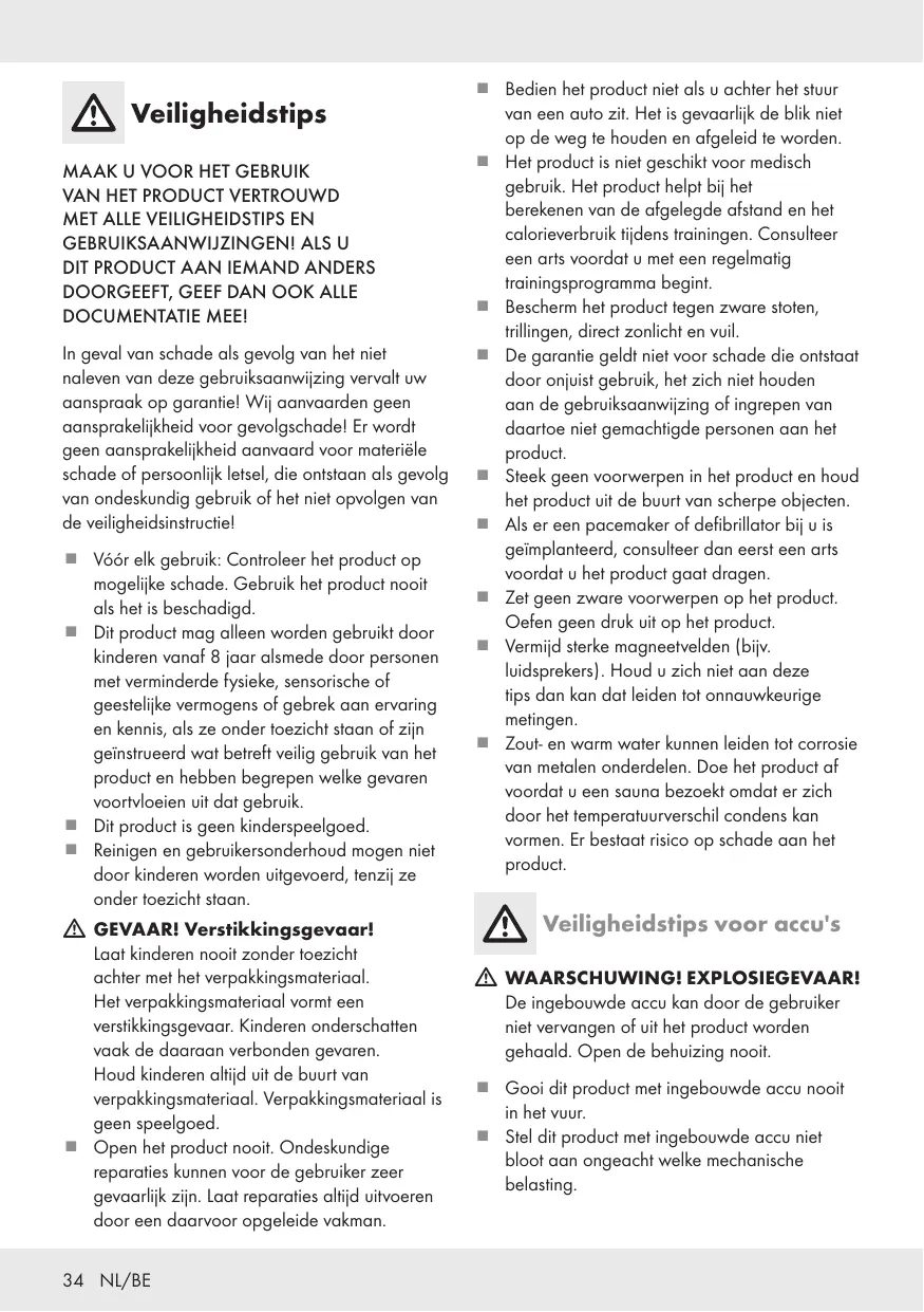 Protégez le produit des chocs, des vibrations, des rayons directs du soleil et de la saleté. La garantie ne couvre pas les dommages causés par une manipulation inappropriée, le non-respect du manuel d’utilisation ou une altération du produit par des personnes non autorisées. N’insérez aucun objet dans le produit et conservez les objets tranchants hors de portée du produit. Si vous portez un stimulateur cardiaque ou un défibrillateur, consultez votre médecin avant de porter le produit pour la première fois. Ne posez aucun objet lourd sur le produit. N’exercez aucune pression sur le produit. Évitez les champs magnétiques puissants (par ex. haut-parleurs). Le non-respect de cette instruction peut entraîner des mesures inexactes. Le sel et l’eau thermale peuvent entraîner la corrosion des pièces métalliques. Retirez le produit avant d’entrer dans un sauna, car la différence de température peut provoquer de la condensation. Il existe le risque de dommages sur le produit.