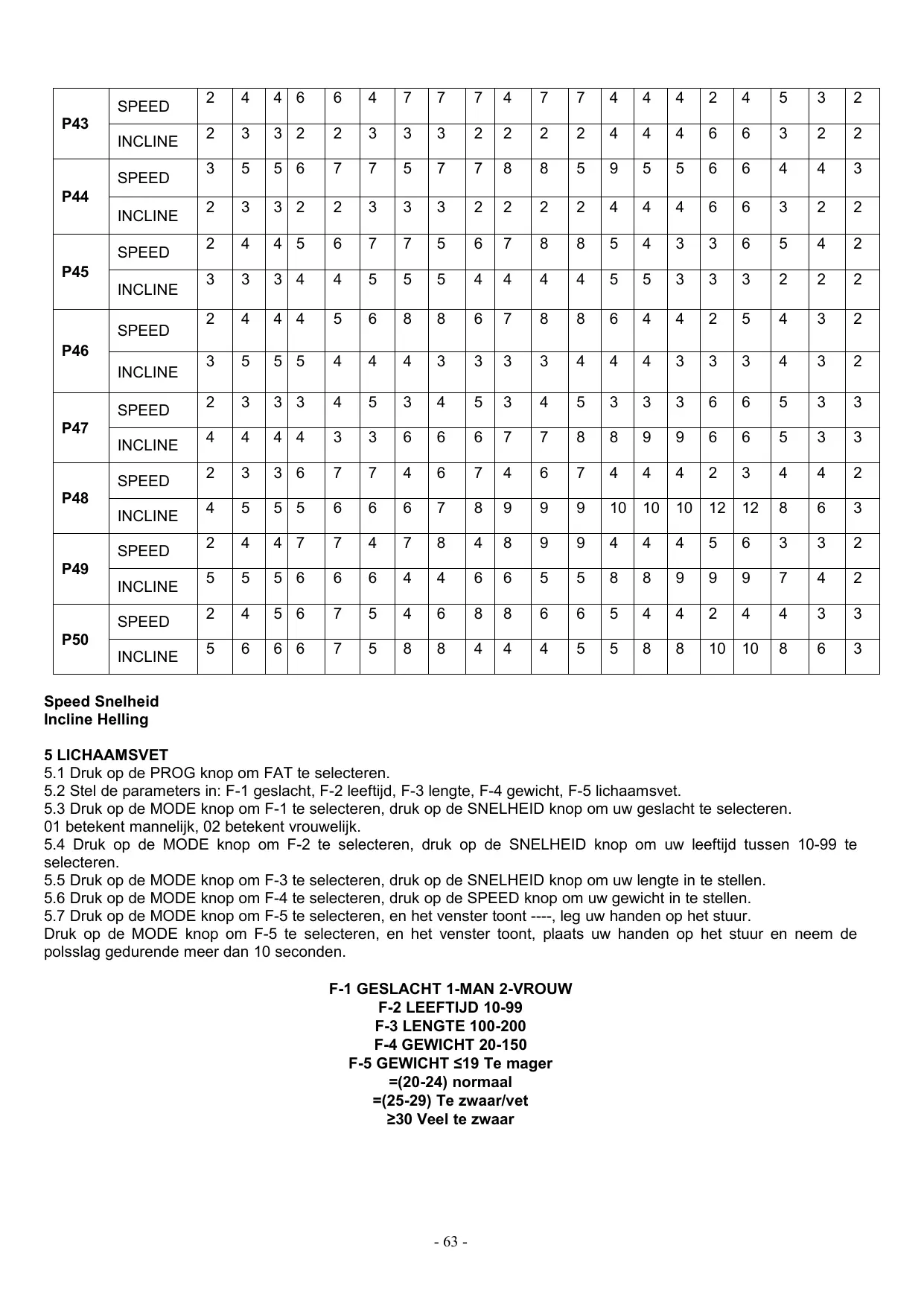 3.3 La touche « INC + / - » En fonctionnement, une pression sur ces touches permet d'augmenter ou de diminuer l'inclinaison d'un niveau à chaque fois ; Si vous appuyez sur ces touches pendant plus de 3 secondes, l'inclinaison augmentera ou diminuera constamment. 3.4 La touche « MODE » : la touche « MODE » à l’état d’arrêt permet de sélectionner le temps, la distance et les calories de façon circulaire. 3.5 Haut-parleur Bluetooth pour écouter de la musique 3.6 Touches de vitesse rapide : 3 KM 3.7 Touches d’inclinaison rapide : 3 Inclinaison 3.8 PROG : Utilisez cette touche pour choisir les programmes : P01-P50 sont des programmes préréglés/ HR1-HR2-HR3 sont des programmes de contrôle de la fréquence cardiaque / MASSE GRASSE : Mesure la masse grasse