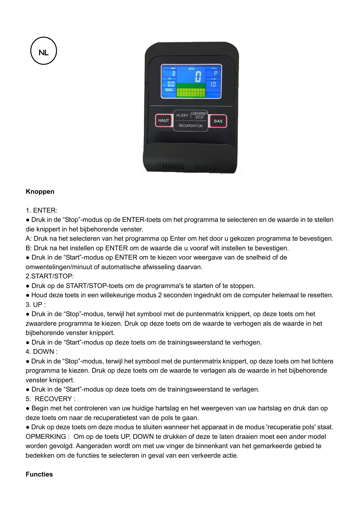 B : Lors du réglage, appuyez sur ENTER pour confirmer la valeur que vous souhaitez prérégler. ● En mode « Start », appuyez sur ENTER pour choisir d'afficher la vitesse ou les tours/minute, ou les faire basculer automatiquement. 2. START/STOP : ● Appuyez sur la touche START/STOP pour démarrer ou arrêter les programmes. ● Au cours de n'importe quel mode, maintenez cette touche enfoncée pendant 2 secondes pour réinitialiser complètement l'ordinateur. 3. UP : ● En mode « Stop » et avec le caractère de la matrice à points qui clignote, appuyez sur cette touche pour sélectionner le programme supérieur. Si la valeur de la fenêtre associée clignote, appuyez sur cette touche pour augmenter la valeur. ● Au cours du mode « Start », appuyez sur cette touche pour augmenter la résistance à l'entraînement. 4. DOWN : ● En mode « Stop » et avec le caractère de la matrice à points qui clignote, appuyez sur cette touche pour sélectionner le programme inférieur. Si la valeur de la fenêtre associée clignote, appuyez sur cette touche pour diminuer la valeur. ● Au cours du mode « Start », appuyez sur cette touche pour diminuer la résistance à l'entraînement. 5. RECOVERY : ● Commencez par vérifier votre fréquence cardiaque actuelle et afficher votre valeur de fréquence cardiaque, appuyez sur cette touche pour accéder au test de récupération du pouls. ● Lorsque vous êtes en mode de récupération du pouls, appuyez sur cette touche pour le quitter. REMARQUE : Pour appuyer sur la touche UP, DOWN ou la faire pivoter, un modèle différent doit être suivi. Il est conseillé de couvrir votre doigt à l'intérieur de la zone marquée pour sélectionner des fonctions en cas d'action erronée.