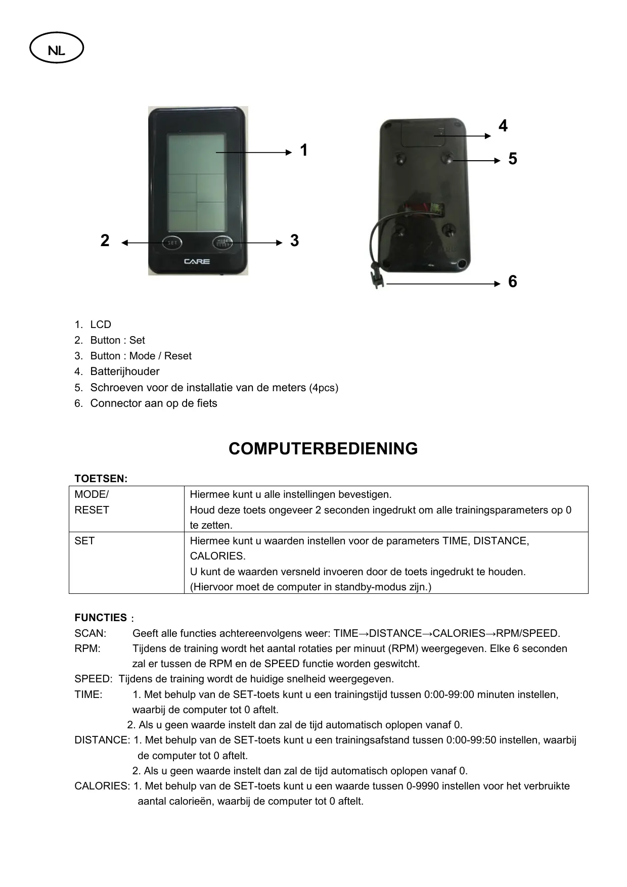 COMPUTERBEDIENING TOETSEN: MODE/ RESET Hiermee kunt u alle instellingen bevestigen. Houd deze toets ongeveer 2 seconden ingedrukt om alle trainingsparameters op 0 te zetten. SET Hiermee kunt u waarden instellen voor de parameters TIME, DISTANCE, CALORIES. U kunt de waarden versneld invoeren door de toets ingedrukt te houden. (Hiervoor moet de computer in standby-modus zijn.) FUNCTIES: SCAN: Geeft alle functies achtereenvolgens weer: TIME→DISTANCE→CALORIES→RPM/SPEED. RPM: Tijdens de training wordt het aantal rotaties per minuut (RPM) weergegeven. Elke 6 seconden zal er tussen de RPM en de SPEED functie worden geswitcht. SPEED: Tijdens de training wordt de huidige snelheid weergegeven. TIME: