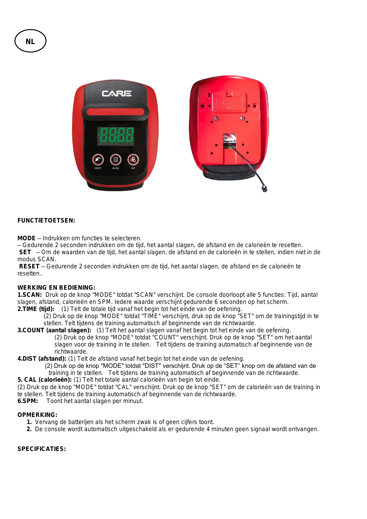 1.SCAN: Druk op de knop "MODE" totdat "SCAN" verschijnt. De console doorloopt alle 5 functies: Tijd, aantal slagen, afstand, calorieën en SPM. Iedere waarde verschijnt gedurende 6 seconden op het scherm. 2.TIME (tijd): (1) Telt de totale tijd vanaf het begin tot het einde van de oefening. (2) Druk op de knop "MODE" totdat "TIME" verschijnt, druk op de knop "SET" om de trainingstijd in te stellen. Telt tijdens de training automatisch af beginnende van de richtwaarde. 3.COUNT (aantal slagen): (1) Telt het aantal slagen vanaf het begin tot het einde van de oefening. (2) Druk op de knop "MODE" totdat "COUNT" verschijnt. Druk op de knop "SET" om het aantal slagen voor de training in te stellen. Telt tijdens de training automatisch af beginnende van de richtwaarde. 4.DIST (afstand): (1) Telt de afstand vanaf het begin tot het einde van de oefening. (2) Druk op de knop "MODE" totdat "DIST" verschijnt. Druk op de “SET” knop om de afstand van de training in te stellen. Telt tijdens de training automatisch af beginnende van de richtwaarde. 5. CAL (calorieën): (1) Telt het totale aantal calorieën van begin tot einde. (2) Druk op de knop "MODE" totdat "CAL" verschijnt. Druk op de knop "SET" om de calorieën van de training in te stellen. Telt tijdens de training automatisch af beginnende van de richtwaarde.