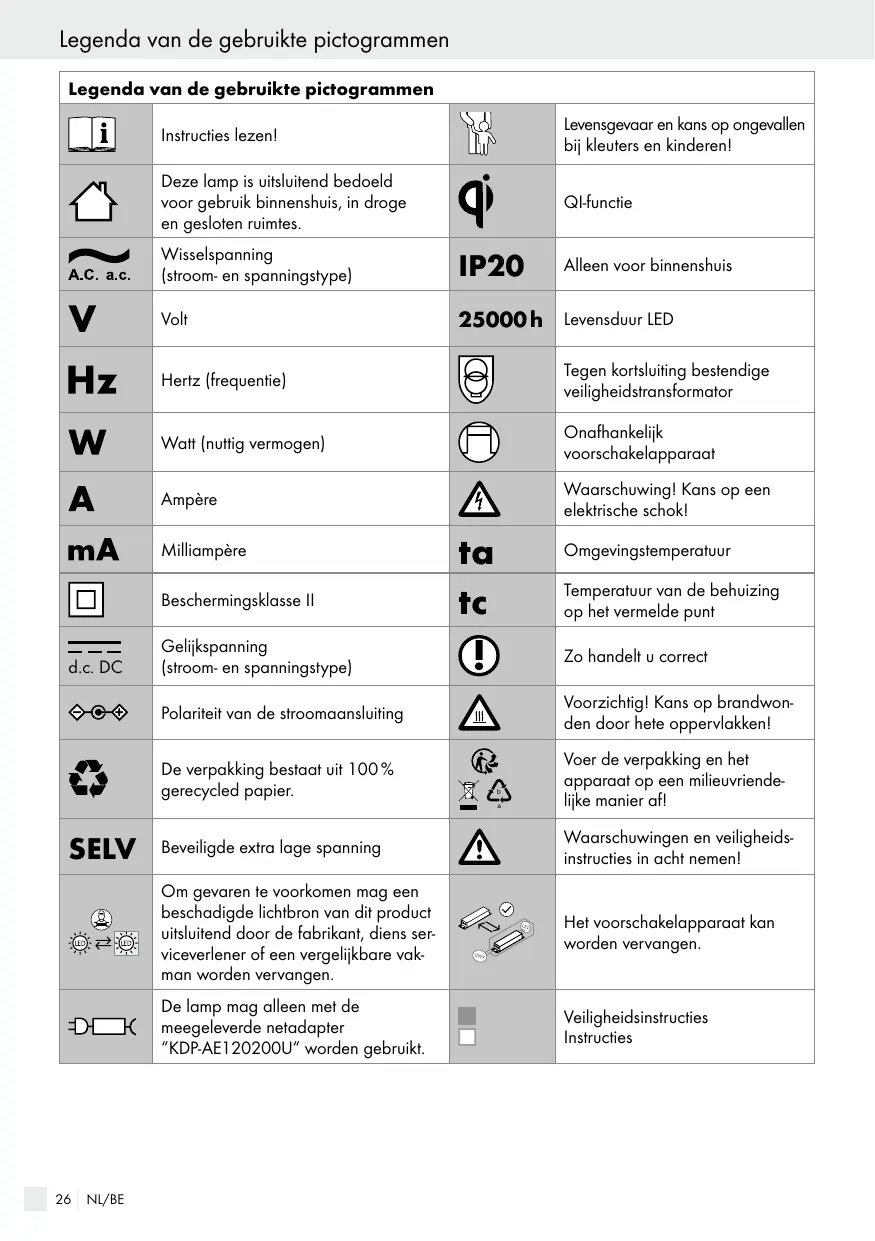 DANGER DE MORT ET RISQUE D‘ACCIDENT POUR LES ENFANTS EN BAS ÂGE ET LES ENFANTS ! Ne laissez jamais les enfants jouer sans surveillance avec l’emballage. Ils peuvent s‘étouffer avec les matériaux de l‘emballage. Les enfants sous-estiment souvent le danger. Cet appareil peut être utilisé par des enfants de 8 ans et plus ainsi que par des personnes avec des capacités physiques, psychiques ou sensorielles limitées ou manquant d‘expérience ou de connaissance, s‘ils sont surveillés ou s‘ils ont été informés de l‘utilisation de l‘appareil de manière sûre et comprennent les risques découlant de son utilisation. Ne laissez pas les enfants jouer avec le produit. Le nettoyage et la maintenance domestique de l’appareil ne doivent pas être effectués par un enfant sans surveillance. RISQUE DE BLESSURES ! Ne laissez pas la lampe ou le matériel d‘emballage traîner sans surveillance. Les films et les sachets en plastique, les éléments en matières synthétiques, etc. peuvent constituer des jouets dangereux pour les enfants.