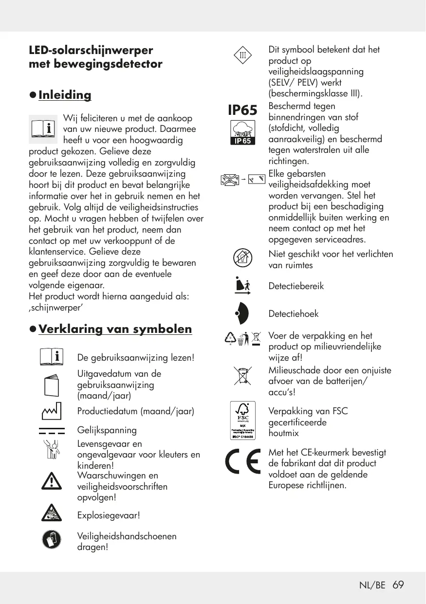Risque de fuite des piles/batteries� 40 Montage���������������������������������������������� 40 Monter le projecteur�������������������������� 41 Orientation du projecteur/panneau solaire�������������������������������������������������� 41 Recharger la batterie������������������������ 41 Utilisation�������������������������������������������� 42 Dépannage����������������������������������������� 42 Nettoyage et stockage��������������������� 42 Recyclage�������������������������������������������� 42 Fecha de fabricación (mes/año). Corriente continua. ¡Peligro de muerte y de accidentes para bebés y niños! ¡Observe las indicaciones de advertencia y de seguridad! ¡Peligro de explosión! Lleve guantes de protección.