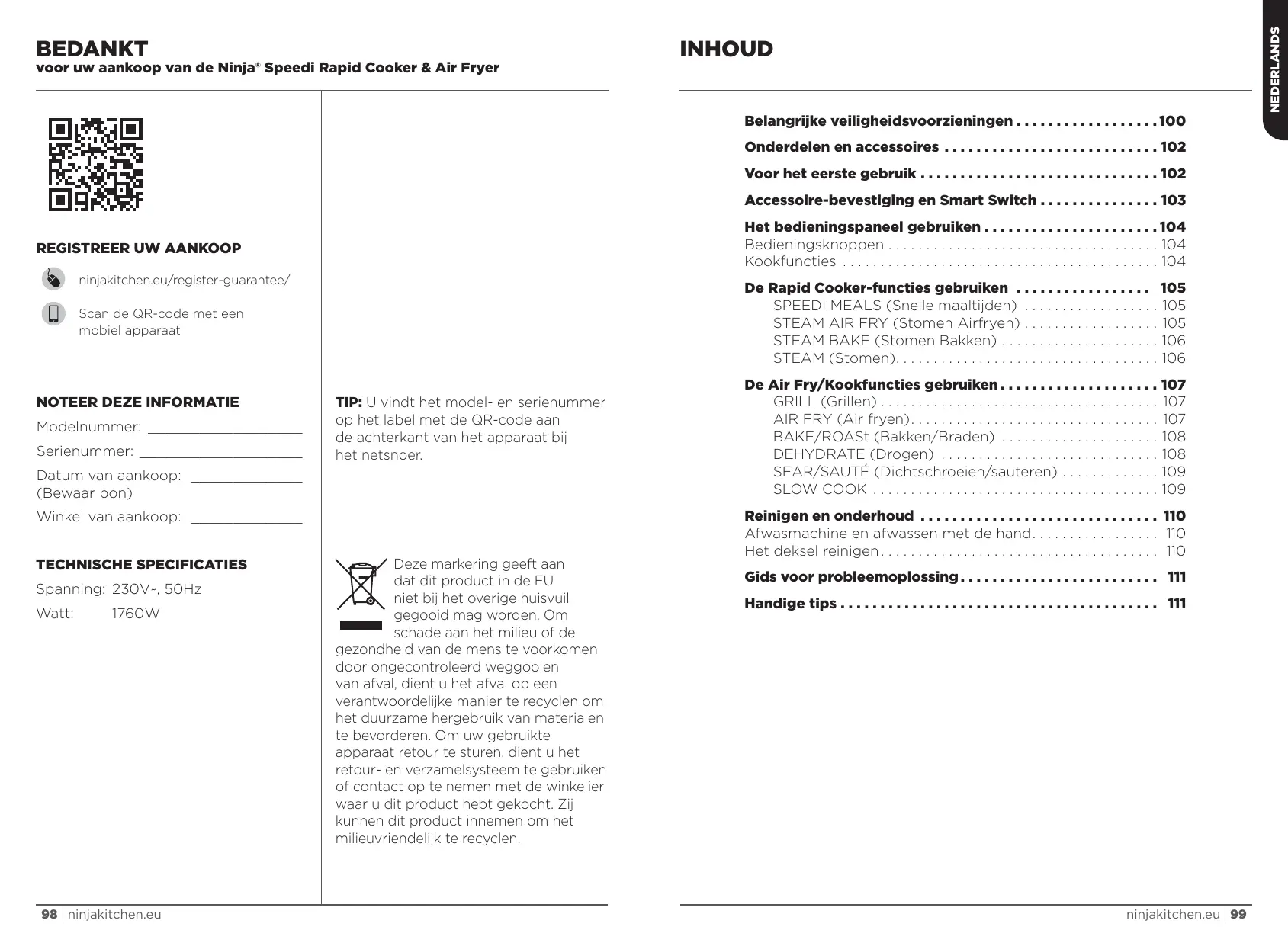 + Het apparaët functioneert niet goed. U vindt ook online ondersteuning op wwwninjakitchen.eu