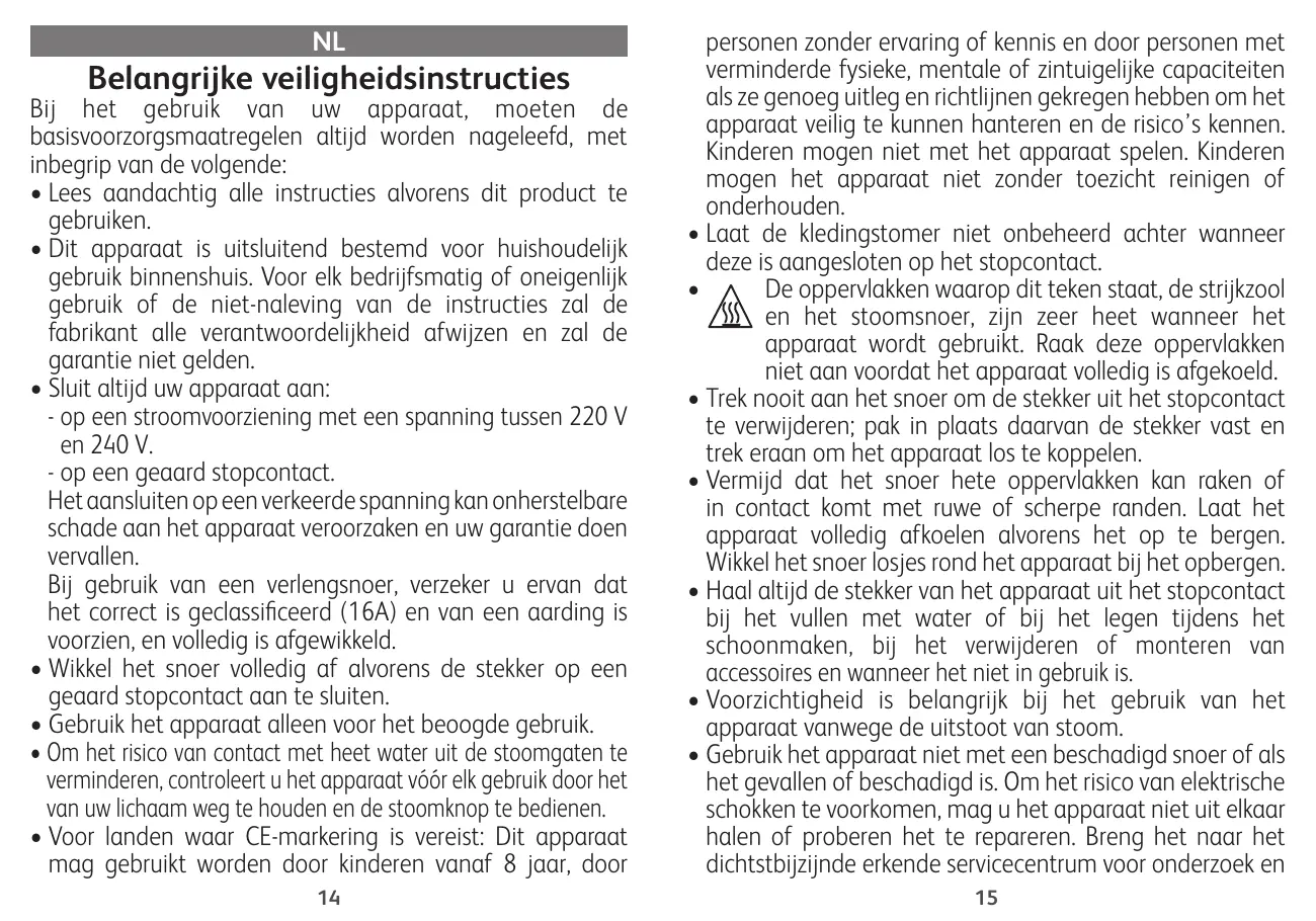Surveillez attentivement les enfants lorsqu'ils utilisent l'appareil ou se trouvent à proximité de celui-ci. Ne laissez jamais l'appareil sans surveillance lorsqu'il est branché sur l'alimentation électrique. Une fois l'appareil débranché, attendez qu'il ait refroidi (environ 1 heure) avant de le ranger. Tout contact avec les parties plastiques ou métalliques chaudes de l'appareil, l'eau chaude ou la vapeur peut entrainer des brûlures. Soyez prudent lorsque vous videz un appareil à vapeur. Le réservoir peut contenir de l'eau chaude. Si une rallonge est nécessaire, assurez-vous que sa tension nominale est de 16 A. Une rallonge d'une tension nominale inférieure peut entraîner un risque d'incendie ou d'électrocution en raison d'une surchauffe. Soyez prudent lorsque vous installez la rallonge afin qu'elle ne puisse pas être tirée ou causer une chute.