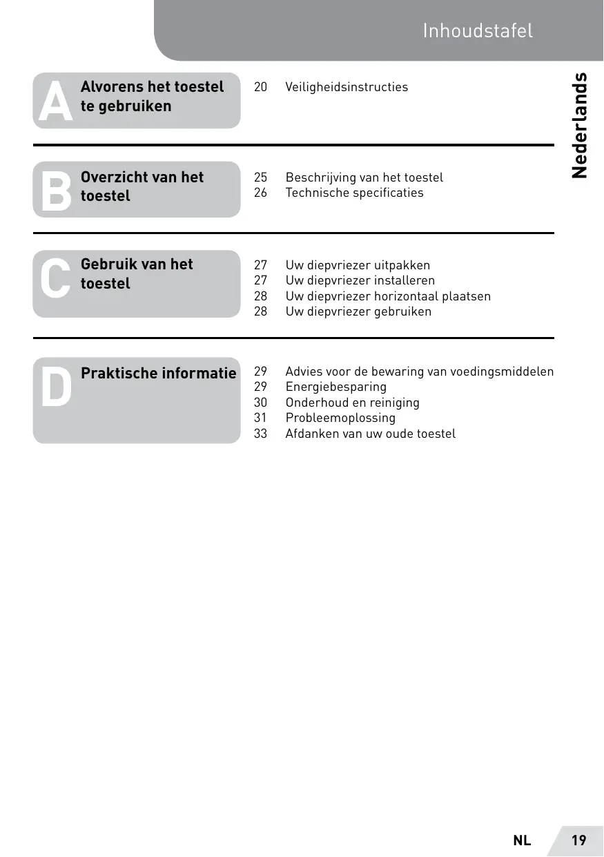 Alvorens het toestel 20 Veiligheidsinstructies te gebruiken Overzicht van het 25 Beschrijving van het toestel toestel 26 Technische specificaties Gebruik van het 27 Uw diepvriezer uitpakken toestel 27 Uw diepvriezer installeren 28 Uw diepvriezer horizontaal plaatsen 28 Uw diepvriezer gebruiken Praktische informatie 29 Advies voor de bewaring van voedingsmiddelen 29 Energiebesparing 30 Onderhoud en reiniging 31 Probleemoplossing 33 Afdanken van uw oude toestel