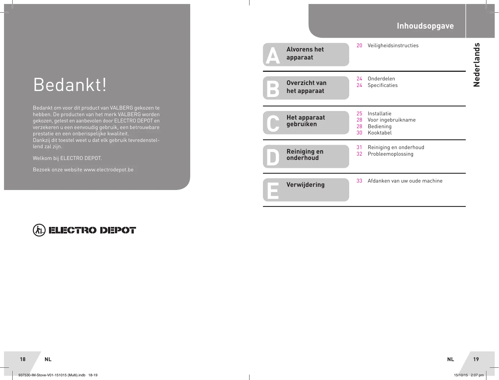 Bedankt om voor dit product van VALBERG gekozen te hebben. De producten van het merk VALBERG worden 25 Installatie gekozen, getest en aanbevolen door ELECTRO DEPOT en Het apparaat 28 Voor ingebruïkname verzekeren ü een eenvoudig gebruik, een betrouwbare gebru 28 Bediening prestatie en een onberispelijke kwaliteit. 30 Kooktabel Dankzij dit toestel weet u dat elk gebruik tevredenstel- lend zal zijn. 31 Reiniging en onderhoud DE