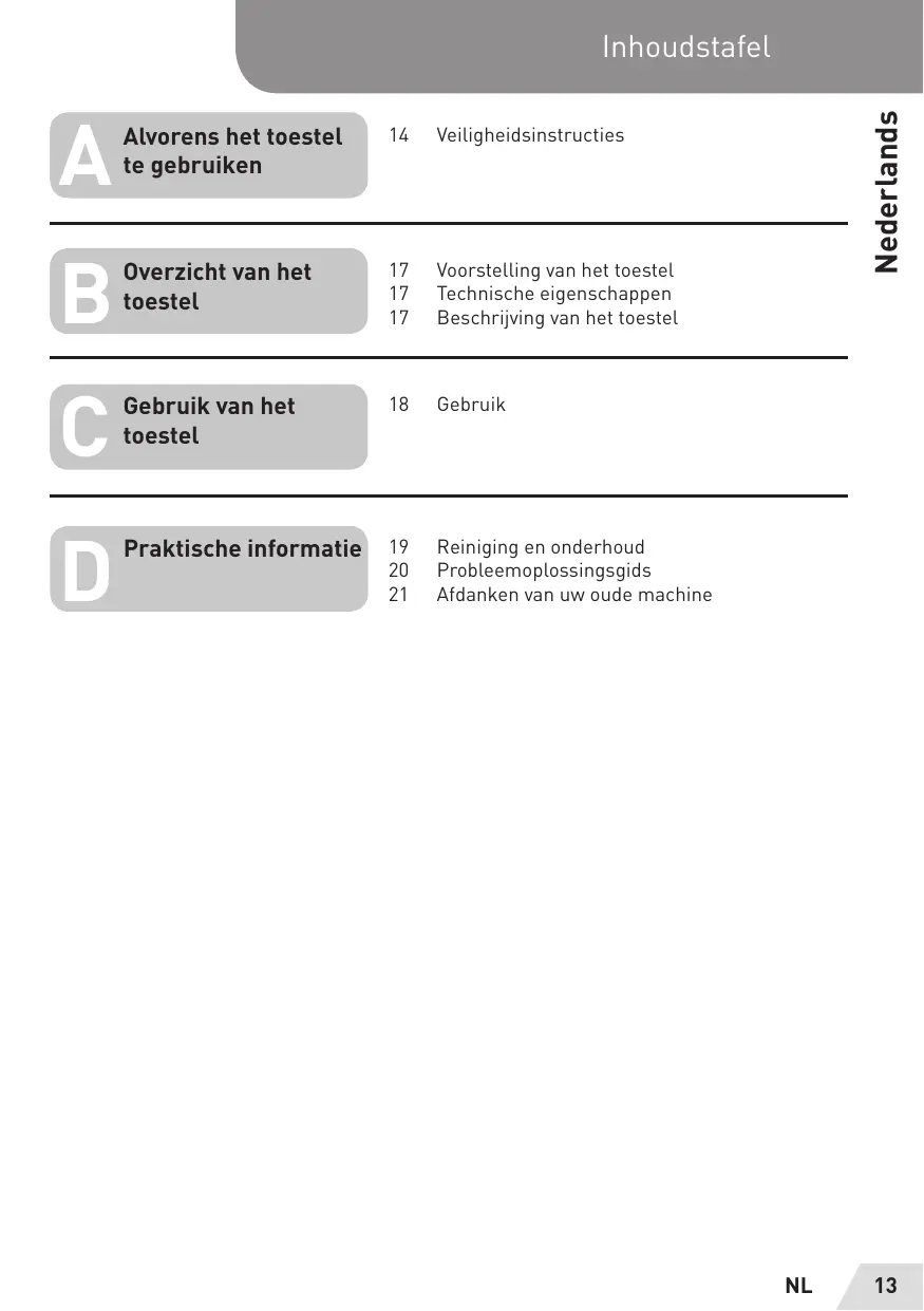 Overzicht van het 17. Voorstelling van het toestel Zz ol 17 Technische eigenschappen 17 Beschrijving van het toestel Gebruik van het 18 Gebruik toestel Praktische informatie 1? Reiniging en onderhoud 20 Probleemoplossingsgids 21 Afdanken van uw oude machine NL 13