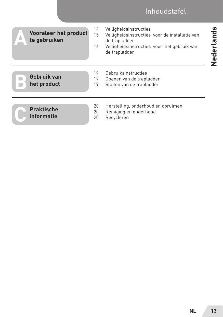 - Vóor het gebruik dient u alle onderdelen van de ladder te controlleren. Gebruik de ladderniet wanner er onderdelen ontbreken, beschadigd of gebruikt zich.