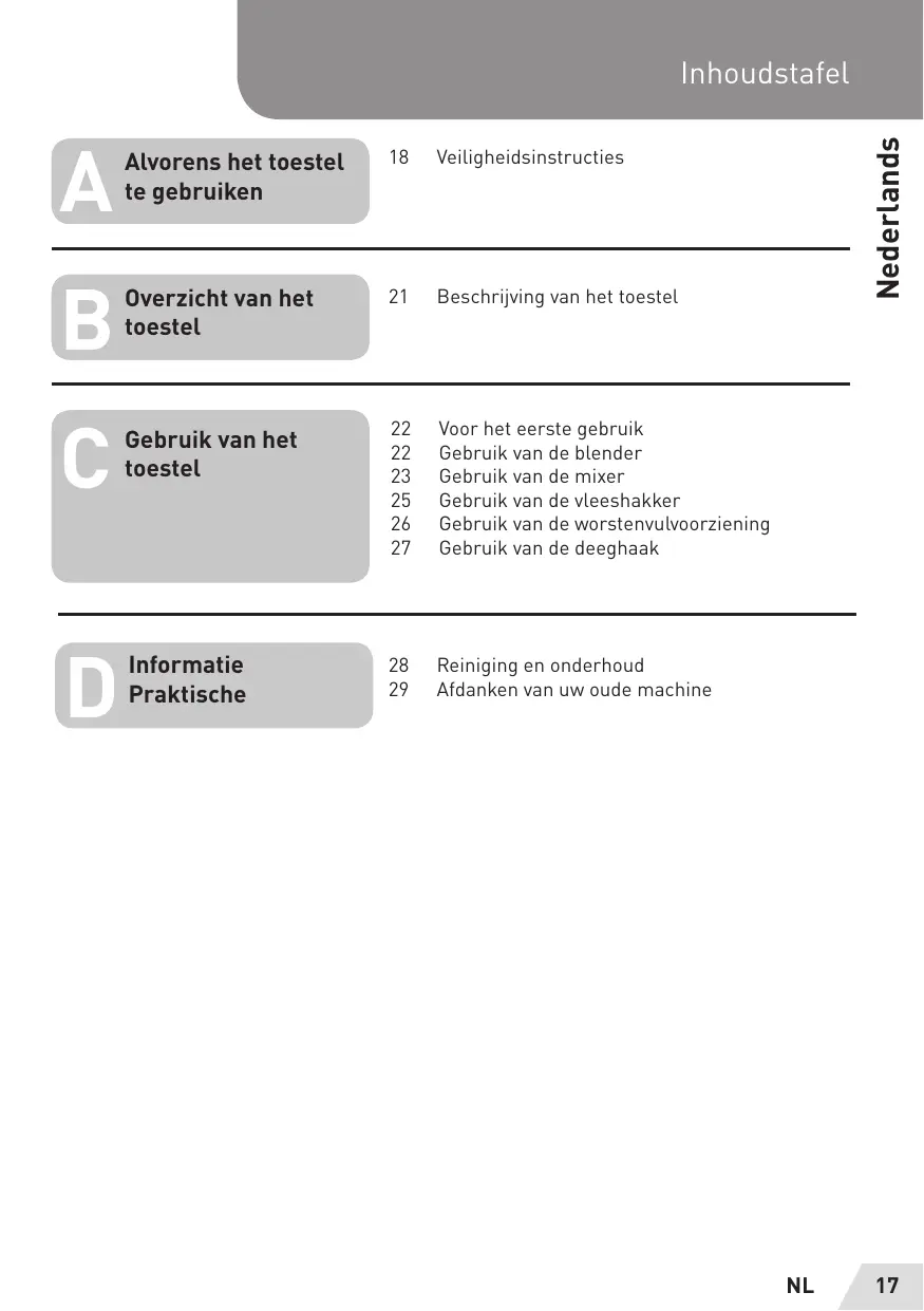 Inhoudstafel Alvorens het toestel 18 Veiligheidsinstructies te gebruiken Overzicht van het 21 Beschrijving van het toestel toestel : 22 Voor het eerste gebruik Gciruiti vente 22 Gebruik van de blender toestel 23 Gebruik van de mixer 25 Gebruik van de vleeshakker 26 Gebruik van de worstenvulvoorziening 27 Gebruik van de deeghaak Informatie 28 Reiniging en onderhoud Praktische 29 Afdanken van uw oude machine