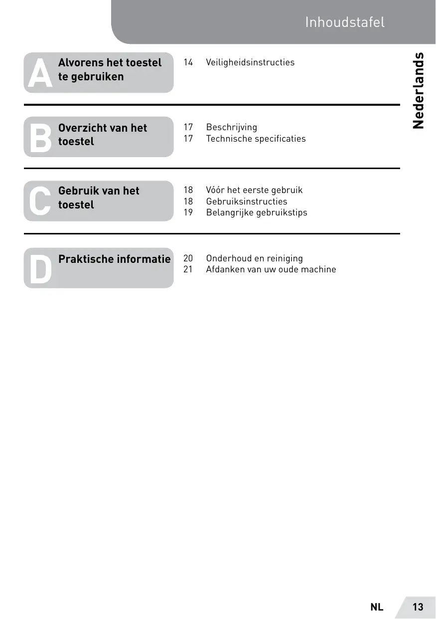 Beschrijving Technische specificaties Gebruik van het toestel Vôér het eerste gebruik Gebruiksinstructies Belangrijke gebruikstips Praktische informatie Onderhoud en reiniging Afdanken van uw oude machine