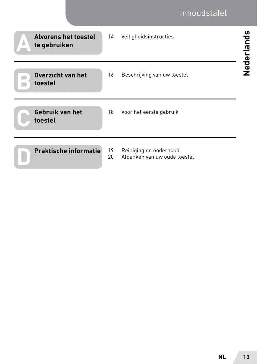 Inhoudstafel Veiligheidsinstructies Overzicht van het toestel Beschrijving van uw toestel Gebruik van het toestel Voor het eerste gebruik Praktische informatie