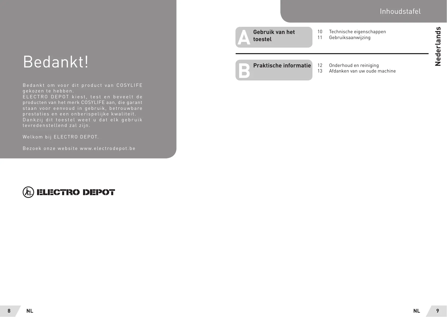 B e d a n Kkt | Praktische informatie 12 Onderhoud en reiniging 13 Afdanken van uw oude machine Bedankt om voor dit product van COSYLIFE gekozen te hebben. ELECTRO DEPOT kiest, test en beveelt de producten van het merk COSYLIFE aan, die garant staan voor eenvoud in gebruik, betrouwbare prestaties en een onberispelijke kwaliteit Dankzij dit toestel weet u dat elk gebruik tevredenstellend zal zijn. Welkom bij ELECTRO DEPOT Bezoek onze website www.electrodepot.be