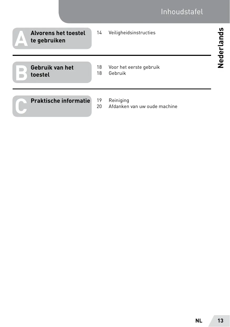 Inhoudstafel Alvorens het toestel 14 Veiligheidsinstructies te gebruiken Gebruik van het 18 Voor het eerste gebruik toestel 18 Gebruik Praktische informatie 17 Reiniging 20 Afdanken van uw oude machine