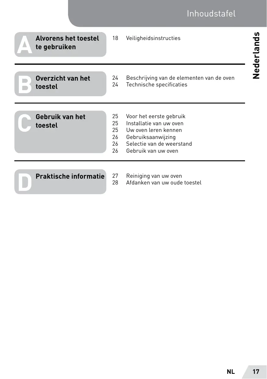 Inhoudstafel Alvorens het toestel 18 Veiligheidsinstructies te gebruiken Overzicht van het 24 Beschrijving van de elementen van de oven toestel 24 Technische specificaties Gebruik van het 25 Voor het eerste gebruik toestel 25 Installatie van uw oven este 25 Uwoven leren kennen 26 Gebruiksaanwijzing 26 Selectie van de weerstand 26 Gebruik van uw oven Praktische informatie 27 Reiniging van uw oven 28 Afdanken van uw oude toestel