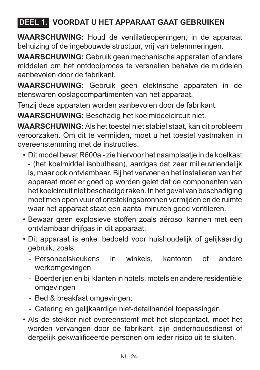 BAIE VOORDAT U HET APPARAAT GAAT GEBRUIKEN WAARSCHUWING: Houd de ventilatieopeningen, in de apparaat behuizing of de ingebouwde structuur, vrij van belemmeringen. WAARSCHUWING: Gebruik geen mechanische apparaten of andere middelen om het ontdooiproces te versnellen behalve de middelen aanbevolen door de fabrikant. WAARSCHUWING: Gebruik geen elektrische apparaten in de etenswaren opslagcompartimenten van het apparaat. Tenzij deze apparaten worden aanbevolen door de fabrikant. WAARSCHUWING: Beschadig het koelmiddelcircuit niet. WAARSCHUWING: Als het toestel niet stabiel staat, kan dit probleem veroorzaken. Om dit te vermijden, moet u het toestel vastmaken in overeenstemming met de instructies. + Dit model bevat R600a - zie hiervoor het naamplaatje in de koelkast - (het koelmiddel isobuthaan), aardgas dat zeer milieuvriendelijk is, maar ook ontvlambaar. Bij het vervoer en het installeren van het apparaat moet er goed op worden gelet dat de componenten van het koelcircuit niet beschadigd raken. In het geval van beschadiging moet men open vuur of ontstekingsbronnen vermijden en de ruimte waar het apparaat staat een aantal minuten goed ventileren. Bewaar geen explosieve stoffen zoals aërosol kannen met een ontvlambaar drijfgas in dit apparaat. Dit apparaat is enkel bedoeld voor huishoudelijk of gelijkaardig gebruik, zoals; Personeelskeukens in winkels, Kkantoren of andere werkomgevingen Boerderijen en bij klanten in hotels, motels en andere residentièle omgevingen - Bed & breakfast omgevingen; - Catering en gelijkaardige niet-detailhandel toepassingen - Als de stekker niet overeenstemt met het stopcontact, moet het worden vervangen door de fabrikant, zijn onderhoudsdienst of dergelijk gekwalificeerde personen om ieder risico uit te sluiten. NL -24-