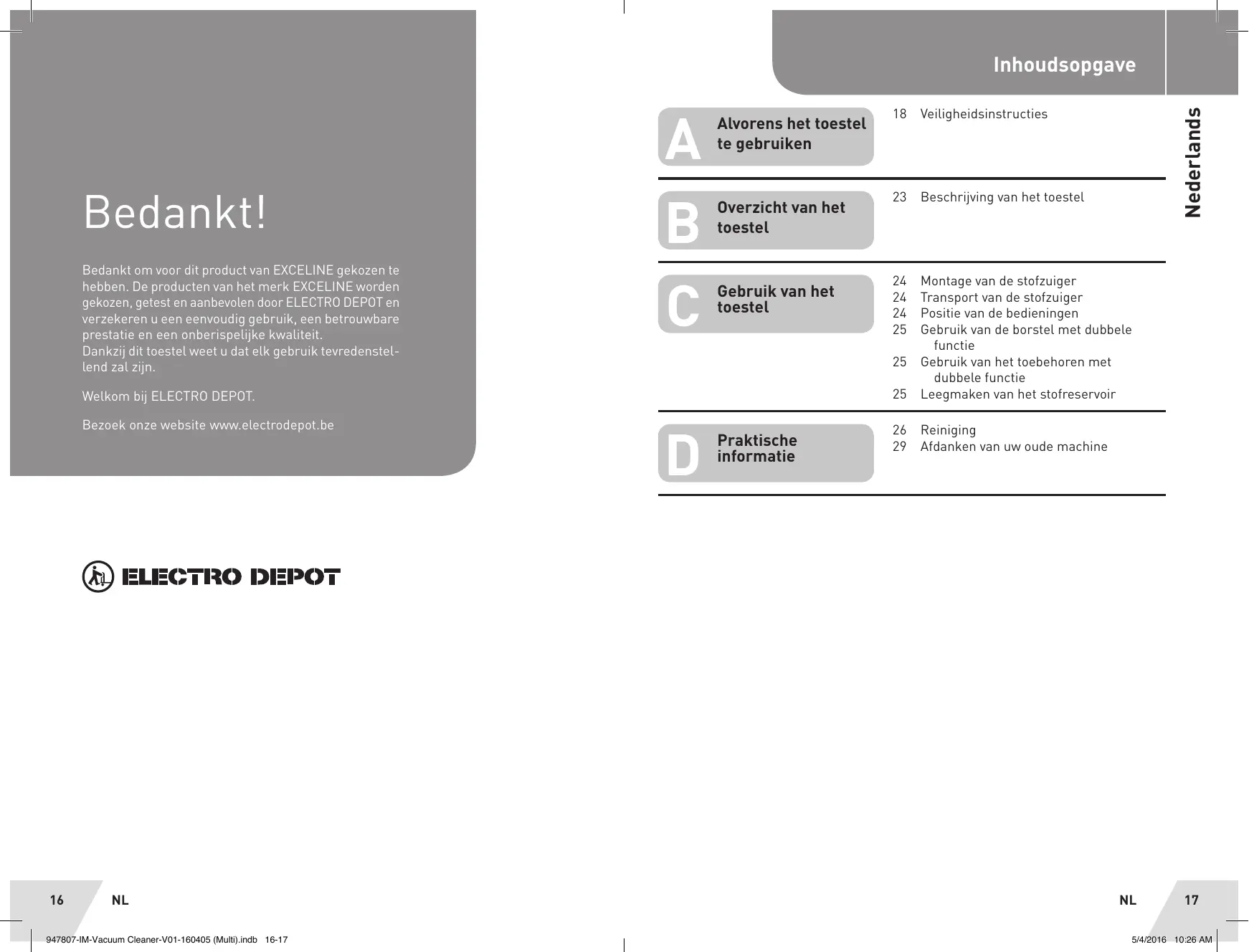mn TD a 23 Beschrijving van het toestel o B a) d an Kkt | Overzicht van het Z " toestel Bedankt om voor dit product van EXCELINE gekozen te D on de aobui hebben. De producten van het merk EXCELINE worden Gebruik van het ontage van de stoizuiger gekozen, getest en aanbevolen door ELECTRO DEPOT en este 24 Transport van de stofzuiger verzekeren u een eenvoudig gebruik, een betrouwbare 24 Positie van de bedieningen prestatie en een onberispelijke kwaliteit. 25 Gebruik van de borstel met dubbele Dankzij dit toestel weet u dat elk gebruik tevredenstel- functie lend zal zijn. 25 Gebruik van het toebehoren met dubbele functie Welkom bij ELECTRO DEPOT. 25 Leegmaken van het stofreservoir Bezoek onze website www.electrodepot.be 26 Reinigin : g Praktische 29. Afdanken van uw oude machine informatie TRO DEPOT 16 NL NL 17 247807-IM-Vacuum Cleaner-V01-160405 (Mult).indb 16-17 5142016 10:26 AM