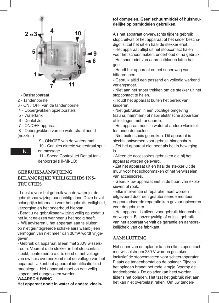 TRUCTIES - Leest u voor het gebruik van de water jet de gebruiksaanwijzing aandachtig door. Deze bevat belangrike informatie voor het gebruik, veiligheid, verzorging en het onderhoud hiervan. - Bergt u de gebruiksaanwijzing veilig op zodat u het kunt nalezen wanneer u het nodig heeft. - Wij adviseren u het apparaat aan te sluiten op niet geïntegreerde schakelaars waarbi een vermogen van niet meer dan 30mA wordt vrijge- geven. - Gebruik dit apparaat alleen met 230V wissels- troom. Voordat u de stekker in het stopcontact steekt, controleert u a.u.b. eerst of het voltage van uw huis overeenkomt met de voltage van het apparaat. U kunt het apparaat identificatie blad raadplegen. Het apparaat moet op een veilig stopcontact aangesloten worden. WAARSCHUWING Het apparaat nooit in water of andere vloeis- tof dompelen. Geen schuurmiddel of huishou- delijke oplosmiddelen gebruiken. Als het apparaat onverwachts tijdens gebruik stopt, uitvalt of het apparaat of het snoer bescha- digd is, zet het uit en haal de stekker eruit. - Het apparaat altid uit het stopcontact halen voor het schoonmaken, onderhoud of na gebruik. - Het snoer niet van aanrechtbladen laten han- gen. - Houdt het apparaat en het snoer weg van hittebronnen. - Gebruik altijd een passend en volledig werkend verlengsnoer. - Niet aan het snoer trekken om de stekker uit het stopcontact te halen. - Houdt het apparaat buiten het bereik van kinderen. - Niet gebruiken in een vochtige omgeving (sauna, hammam) of nabij elektrische apparaten of leidingen met randaarde. - Het apparaat nooit in water of andere vloeistof- fen onderdompelen. - Niet buitenshuis gebruiken. Dit apparaat is slechts ontworpen voor gebruik binnenshuis. - Zet het apparaat niet neer als het in beweging is. - Alleen de accessoires gebruiken die bi het apparaat worden geleverd. - Zet het apparaat uit en haal de stekker uit de muur voor het schoonmaken of het verwisselen van accessoires. - Gebruik uw apparaat niet in de buurt van explo- sieven of rook. - Elke interventie of reparatie moet worden uitgevoerd door een geautoriseerde monteur: ongeautoriseerde reparatie kan gevaar opleveren voor de gebruiker. - Het apparaat is alleen voor gebruik binnenshuis ontworpen. Bij onzorgvuldig of onjuist gebruik van het apparaat vervalt de garantie en aanspra- Kkelikheïd van de fabrikant. AANSLUITING Het snoer van de oplader kan in elke stopcontact met wisselstroom 230 V worden gestoken, inclusief de stopcontacten voor scheerapparaten. Plats de tandenborstel op de oplader. Tidens het opladen brandt het rode lampje (voorop de tandenborstel). De oplader kan heet worden tijdens het opladen. Het tast het gebruik niet aan, het kan niet overbelast raken. Om uw tanden-