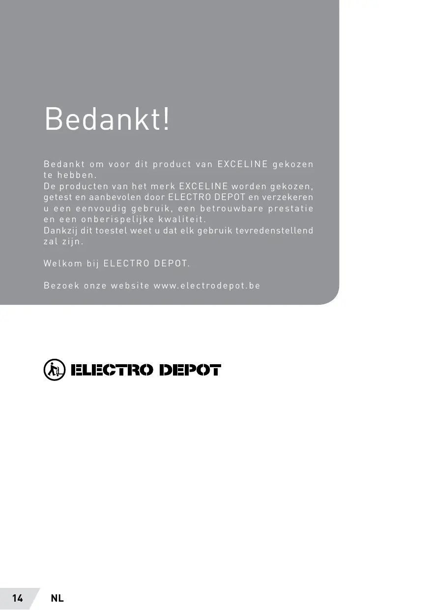 Bedankt! Bedankt om voor dit product van EXCELINE gekozen te hebben. De producten van het merk EXCELINE worden gekozen, getest en aanbevolen door ELECTRO DEPOT en verzekeren u een eenvoudig gebruik, een betrouwbare prestatie en een onberispelijke kwaliteit Dankzij dit toestel weet u dat elk gebruik tevredenstellen zal zijn. Welkom bij ELECTRO DEPOT Bezoek onze website www.electrodepot.be