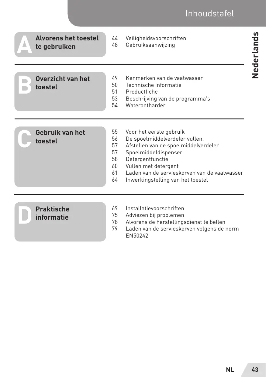 17 Distributeur d'aide au rinçage 18 Fonction de détergent 20 Remplissage du détergent 21 Chargement des casiers du lave-vaisselle 24 Mise en route de l'appareil Informations 29. Instructions d'installation pratiques 35 Conseils en cas de problèmes 38 Avant d'appeler Le service de réparation 39 Chargement des paniers selon La norme