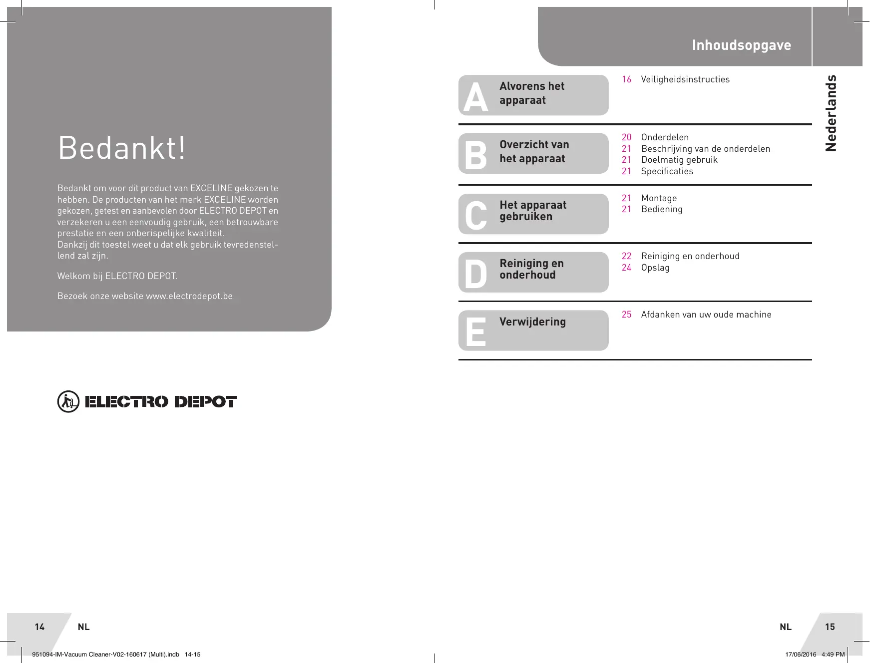 Bedankt! Bedankt om voor dit product van EXCELINE gekozen te hebben. De producten van het merk EXCELINE worden gekozen, getest en aanbevolen door ELECTRO DEPOT en verzekeren u een eenvoudig gebruik, een betrouwbare prestatie en een onberispelijke kwaliteit. Dankzij dit toestel weet u dat elk gebruik tevredenstel- lend zal zin. Welkom bij ELECTRO DEPOT. Bezoek onze website www.electrodepot.be >TRO DEPOT 14 NL 251094-IM-Vacuum Cleaner-V02-160617 (Mult).indb 14-15 Inhoudsopgave Abras ES 16 Veiligheidsinstructies 3 apparaat LL)
