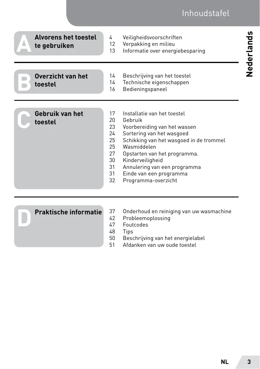 C4 2 25 Introduccién de la ropa en el tambor de La lavadora 25 Los productos detergentes 27 _Inicio del programa 30 Seguridad de los niños 31 Anulaciôn de un programa 31 Fin de un programa 32 Tabla de programas Informaciones 37 Mantenimiento y limpieza de su lavadora Acti 42 Solucién de problemas FÉES 47 Cédigo de averias 48 Consejos 50 Descripciôn de La etiqueta Energia 51 Cémo desechar su antiguo aparato