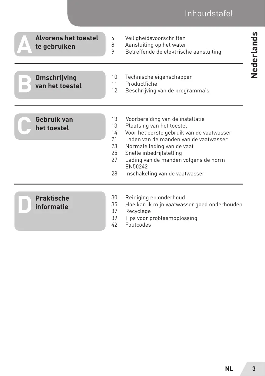 PP 14 Avant la première utilisation du lave-vaisselle 21 Chargement des paniers du lave-vaisselle 23 Chargement normal de la vaisselle 25 Mise en marche rapide 27 Chargement des paniers selon La norme EN50242 28 Démarrage du lave-vaisselle Informations 30 Nettoyage et entretien ñ 35 Comment bien entretenir votre lave-vaisselle ratique: pratiques 37 Recyclage 39 Astuces de dépannage 42 Codes d'erreur