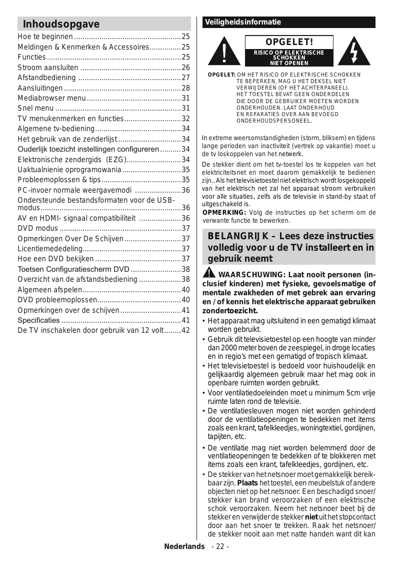 Inhoudsopgave Hoe te beginnen ” Meldingen & Kenmerken & Accessoires Functies … …. Stroom aansluten Afstandbediening Aansluitingen … Mediabrowser menu. Snel menu … TV menukenmerken € en functies Algemene tv-bediening Het gebruik van de zenderist… Ouderlik toezicht instellingen configureren., Elektronische zendergids (EZG).. Uaktualnienie oprogramowania . Probleemoplossen & tips. PC-invoer normale weergavemodi … Ondersteunde bestandsformaten voor de USB- modus… : AV en HDMI. signaal compatibilteit DVD modus . Opmerkingen Over De Schiven Licentiemededeling…. Hoe een DVD bekiken Toetsen Configuratiescherm DVD … Overzicht van de afstandsbediening Algemeen afspelen. DVD probleemoplossen: Opmerkingen over de schiven.. Specificaties De TV inschakelen door gebruik van 12 voit….42 Nederlands Veiligheidsinformatie OPGELET!
