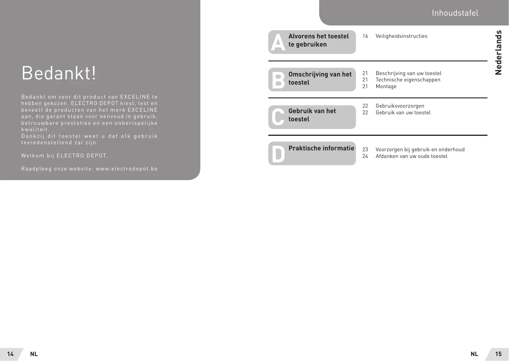 B e d a n Kkt Omschrijvingvanhet 21 Beschrijving van uw toestel toestel 21 Technische eigenschappen 21 Montage Bedankt om voor dit product van EXCELINE te hebben gekozen. ELECTRO DEPOT kiest, test en 22. Gebruiksvoorzorgen beveelt de producten van het merk EXCELINE Gebruik van het 22 Gebruik ven uw toestel aan, die garant staan voor eenvoud in gebruik, Gel betrouwbare prestaties en een onberispelijke kwaliteit. Dankzij dit toestel weet u dat elk gebruik tevredenstellend zal zijn. Praktische informatie 23 Voorzorgen bij gebruik en onderhoud Welkom bij ELECTRO DEPOT. 24 Afdanken van uw oude toestel Raadpleeg onze website: www.electrodepot.be 14 NL NL 15