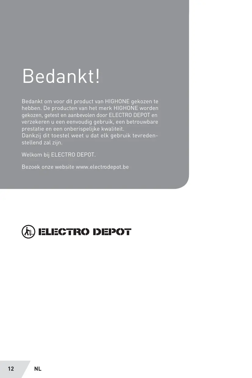 Bedankt om voor dit product van HIGHONE gekozen te hebben. De producten van het merk HIGHONE worden gekozen, getest en aanbevolen door ELECTRO DEPOT en verzekeren u een eenvoudig gebruik, een betrouwbare prestatie en een onberispelijkke kaliteit.