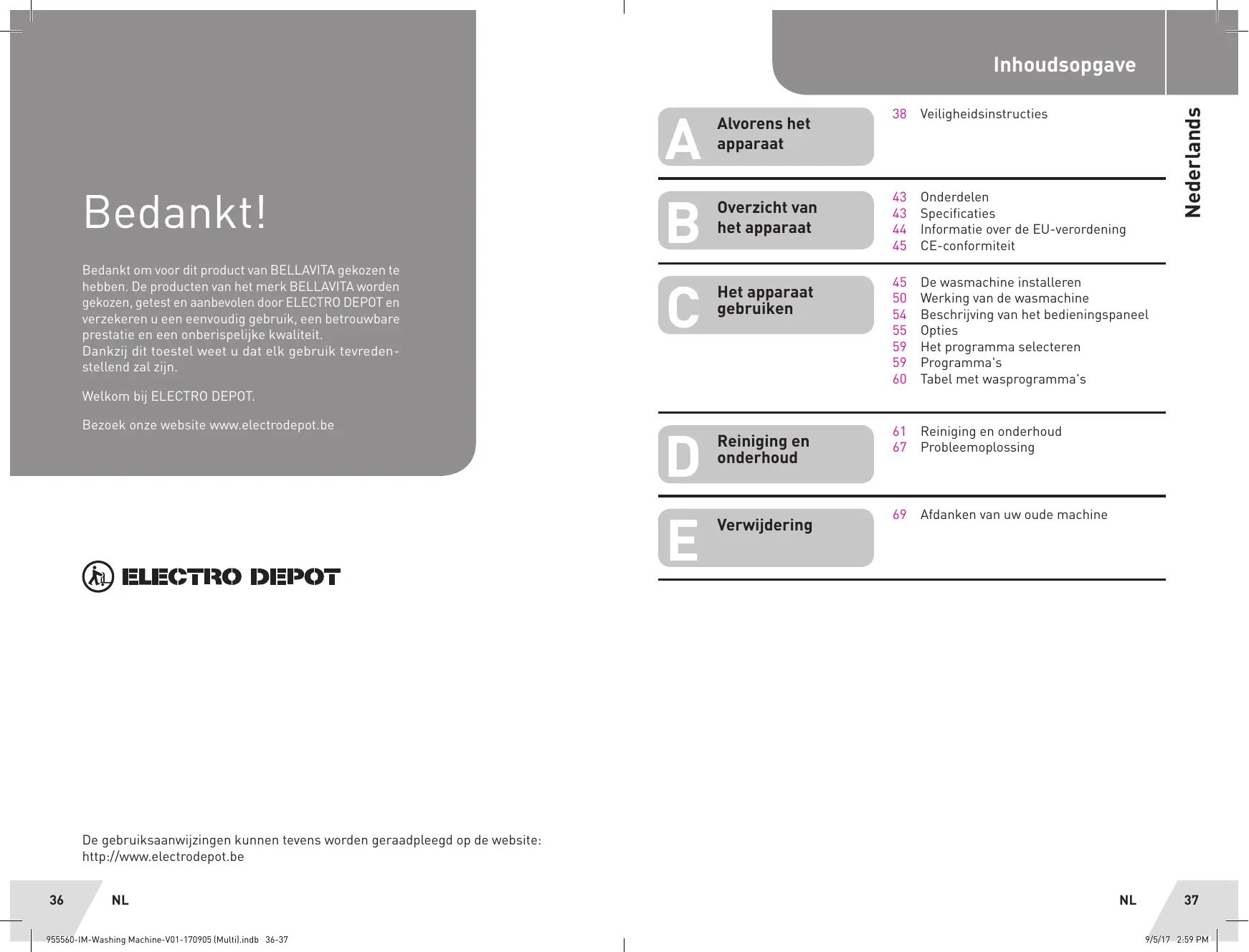 a 43 Onderdelen ] B e d an K t I Overzicht van 43 Specificaties Z . het apparaat 4h Informatie over de EU-verordening 45 CE-conformiteit Bedankt om voor dit product van BELLAVITA gekozen te . hebben. De producten van het merk BELLAVITA worden Het apparaat 15 Dewasmachine installeren gekozen, getest en aanbevolen door ELECTRO DEPOT en gebruiken 50 Werking van de wasmachine verzekeren u een eenvoudig gebruik, een betrouwbare 54° Beschrijving van het bedieningspaneel prestatie en een onberispelijke kwaliteit. 55 Opties Dankzij dit toestel weet u dat elk gebruik tevreden- 59 Het programma selecteren stellend zal zijn 59 Programma's 60 Tabel met wasprogramma's Welkom bij ELECTRO DEPOT. Bezoek onze website www.electrodepot.be 61 Reiniging en onderhoud Reiniging en 67 Pi ï robleemoplossin: onderhoud Pose VA 69 Afdanken van uw oude machine Verwijdering a _ TRO DEPOT De gebruiksaanwijzingen kunnen tevens worden geraadpleegd op de website: http:/{www.electrodepot.be 36 NL NL 37 955560-IM-Washing Machine-VO1-170905 [Mutti.indb_ 36-37 SISNT 2:59 PM