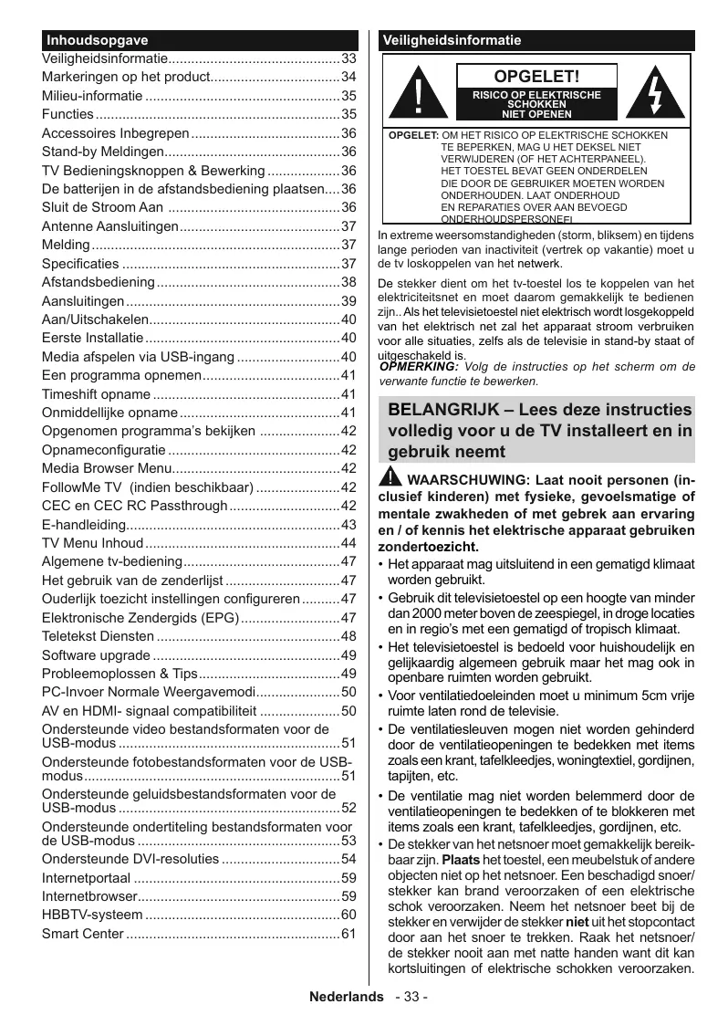 RISICO OP ELEKTRISCHE NIET OPENEN GPGELET: OMHET RISICO OP ÉLERTRISCHE SCHOKKEN E BEPERKEN, MAG U HET DEKSEL NIET VERWIDEREN (OF HET ACHTERPANEEL . HET TOESTEL BEVAT GEEN ONDERDELEN DIE DOOR DE GEBRUIKER MOETEN WORDEN ONDERHOUDEN. LAAT ONDERHOUD EN REPARATIES OVER AAN BEVOEGD ONDERHOUDSPERSONEEL In extreme weersomstandigheden (storm, bliksem) en tiens lange perioden van inactiviteit (vertrek op vakantie) moet u de loskoppelen van het netwerk De stekker dient om het tv-toestel los te koppelen van het elektriciteitsnet en moet daarom gemakkelik te bedienen zijn. ls het televisietoestel niet elektrisch word losgekoppeld van het elektrisch net zal het apparaat stroom verbruiken voor alle situaties, zelfs als de televisie in stand-by staat of uitgeschakeld is, OPMERKING: Volg de instructies op het scherm om de venwante funcie te bewerken.