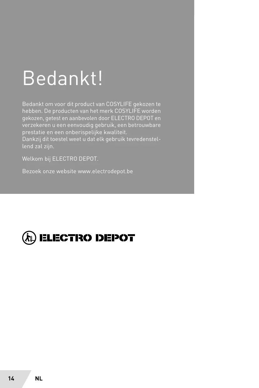 Bedankt! Bedankt om voor dit product van COSYLIFE gekozen te hebben. De producten van het merk COSYLIFE worden gekozen, getest en aanbevolen door ELECTRO DEPOT en verzekeren u een eenvoudig gebruik, een betrouwbare prestatie en een onberispelijke kwaliteit. Dankzij dit toestel weet u dat elk gebruik tevredens lend za Welkom bij ELECTRO DEPOT. Bezoek onze website www.electrodepot.be