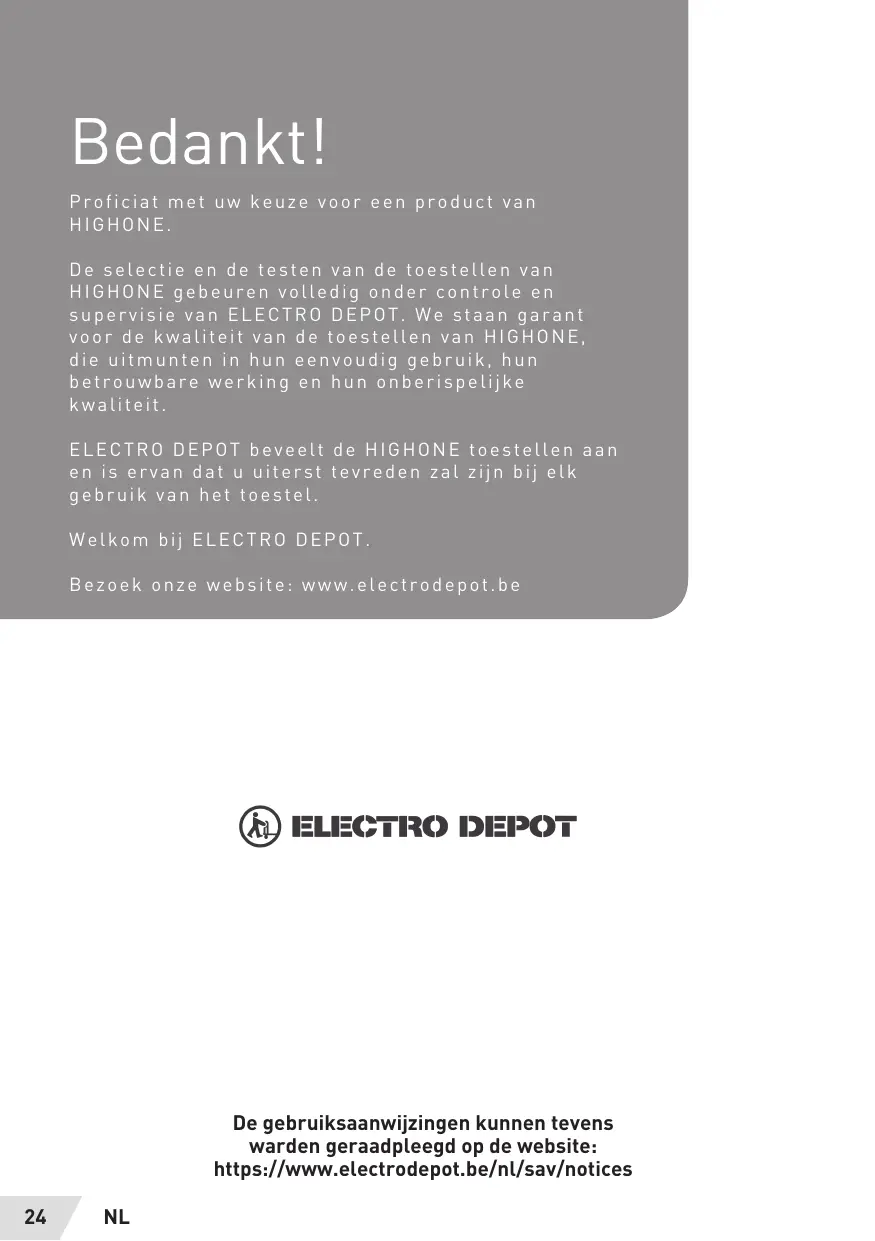 Bedankt! Proficiat met uw keuze voor een product van HIGHONE. De selectie en de testen van de toestellen van HIGHONE gebeuren volledig onder controle en supervisie van ELECTRO DEPOT. We staan garant voor de kwaliteit van de toestellen van HIGHONE, die uitmunten in hun eenvoudig gebruik, hun betrouwbare werking en hun onberispelijke kwaliteit. ELECTRO DEPOT beveelt de HIGHONE toestellen aan en is ervan dat u uiterst tevreden zal zijn bij elk gebruik van het toestel. Welkom bij ELECTRO DEPOT. Bezoek onze website: www.electrodepot.be De gebruiksaanwijzingen kunnen tevens warden geraadpleegd op de website: https://www.electrodepot.be/nl/sav/notices 24 NL