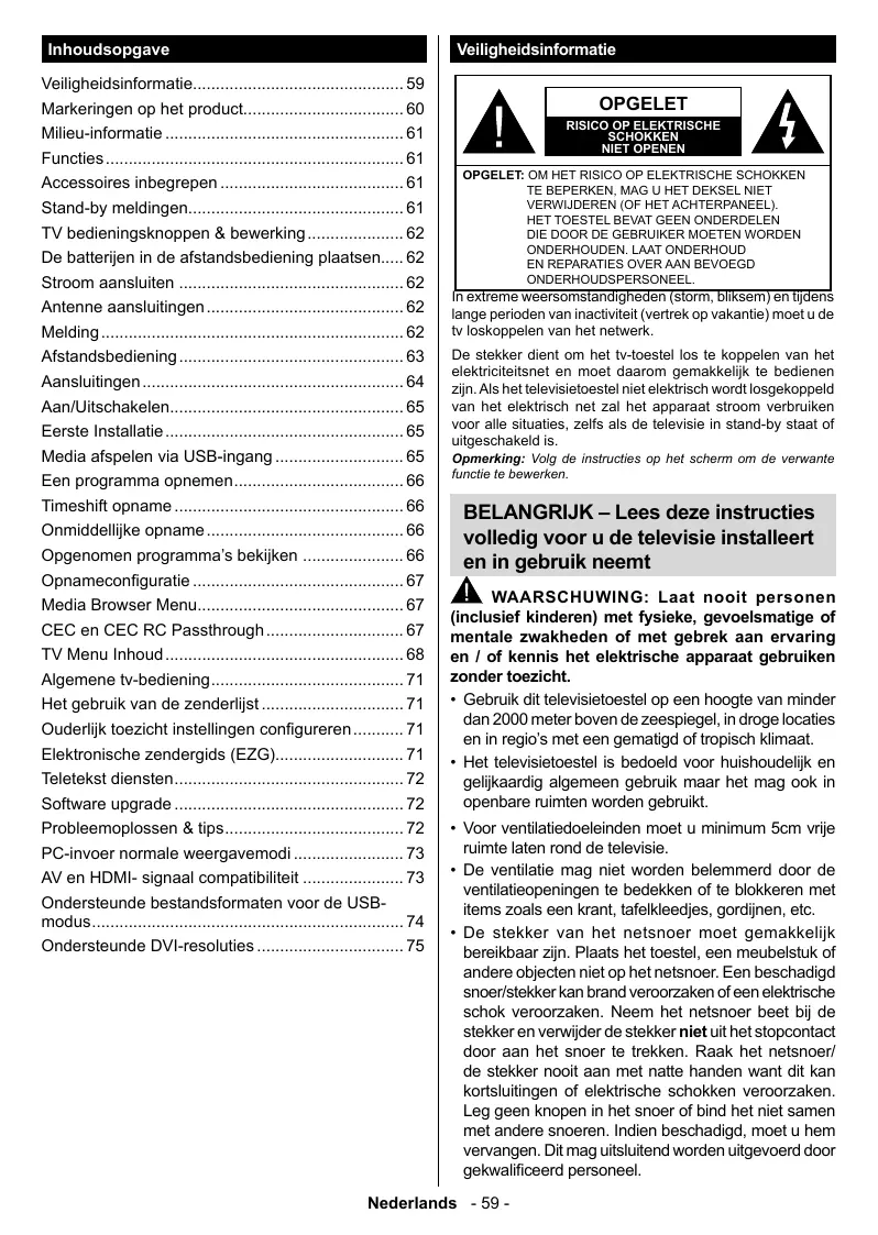 Algemene tv-bediening.………… Het gebruik van de zenderijst … . Ouderlik toezicht instellingen configureren. Elektronische zendergids (EZG). Teletekst diensten… Software upgrade … Probleemoplossen & tips. PC-invoer normale weergavemodi… AV en HDMI- signaal compatibilieit .