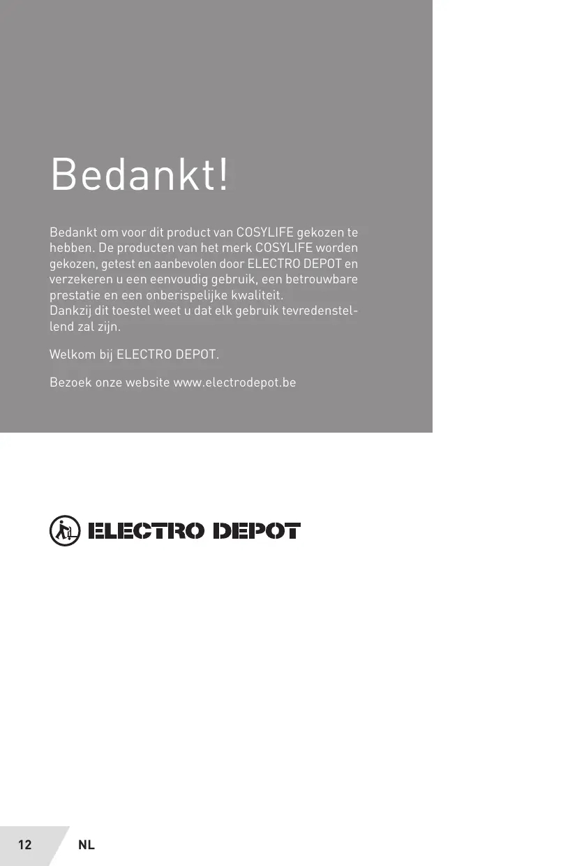 Bedankt! Bedankt om voor dit product van COSYLIFE gekozen te hebben. De producten van het merk COSYLIFE worden gekozen, getest en aanbevolen door ELECTRO DEPOT en verzekeren u een eenvoudig gebruik, een betrouwbare prestatie en een onberispelijke kwaliteit. Dankzij dit toestel weet u dat elk gebruik tevredens lend za Welkom bij ELECTRO DEPOT. Bezoek onze website www.electrodepot.be