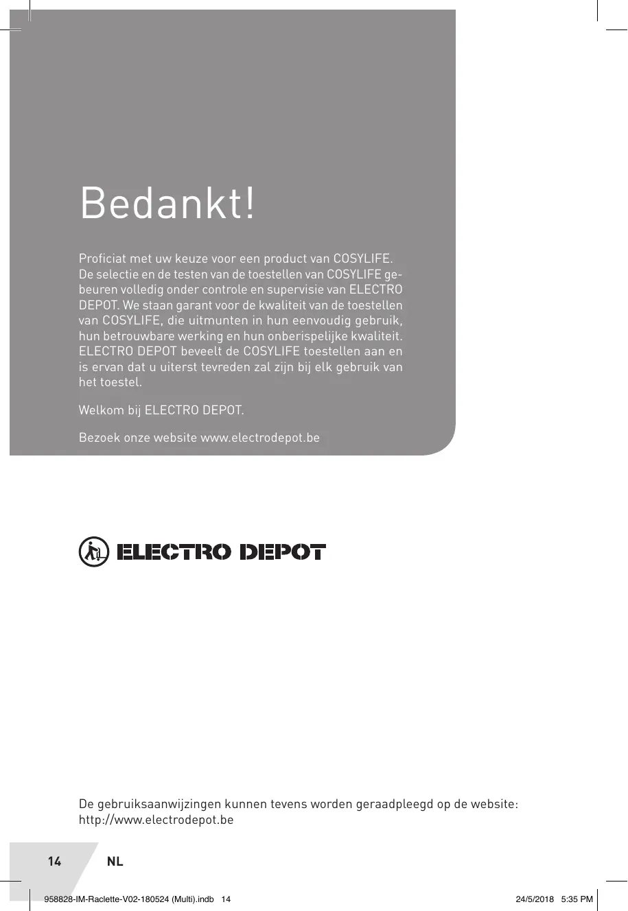 Bedankt! Proficiat met uw keuze voor een product van COSYLIFE. De selectie en de testen van de toestellen van COSYLIFE ge- beuren volledig onder controle en supervisie van ELECTRO DEPOT. We staan garant voor de kwaliteit van de toestellen van COSYLIFE, die uitmunten in hun eenvoudig gebruik, hun betrouwbare werking en hun onberispelike kwaliteit ELECTRO DEPOT beveelt de COSYLIFE toestellen aan en is ervan dat u uiterst tevreden zal zijn bij elk gebruik van het toestel. Welkom bij ELECTRO DEPOT. Bezoek onze website www.electrodepot.be >TRO DEPOT De gebruiksaanwijzingen kunnen tevens worden geraadpleegd op de website: http:/{www.electrodepot.be 14 NL 258828-IM-Raclette-VO2-18024 (Mult).indb 14 2AISI2018 5:36 PM