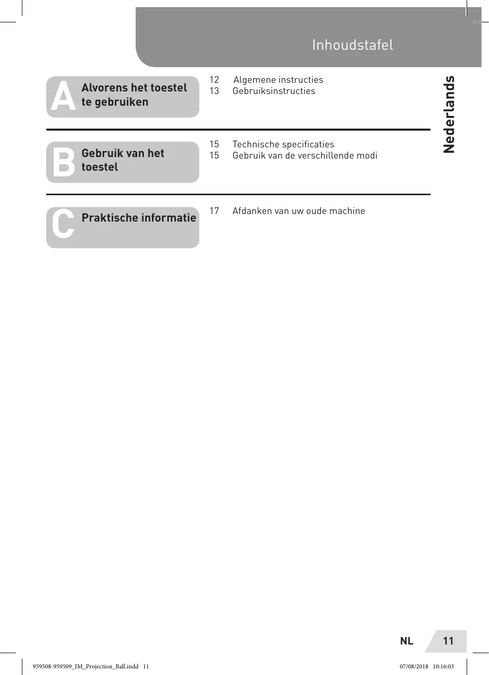: 15 Technische specificaties 2 Gebruik van het 15 Gebruik van de verschillende modi toestel Retediotonett Afdanken van uw oude machine NL 1 959508-950509_ 1M Projection Ballindd 11 07/08/2018 10:16:03