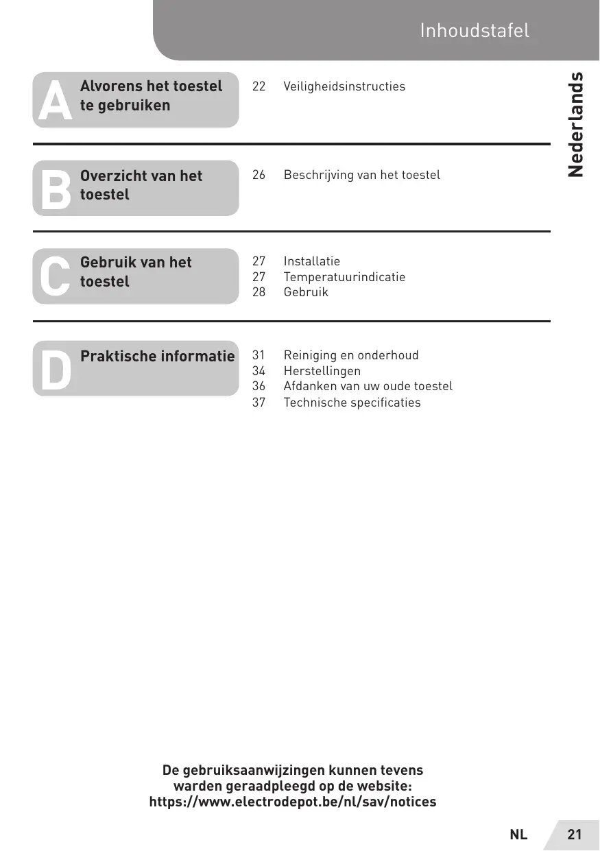 De gebruiksaanwijzingen kunnen tevens warden geraadpleegd op de website: https://www.electrodepot.be/nl/sav/notices