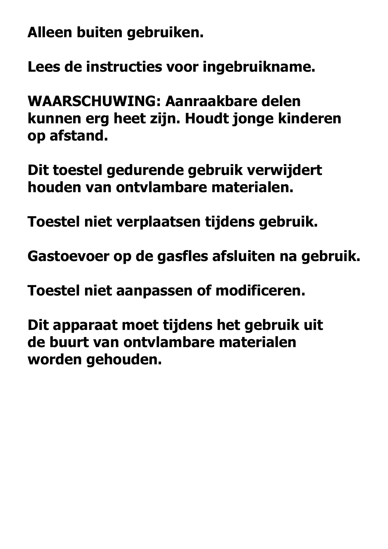 | Uitsluitendvoor buitengebruik.OPGELET: Toegankelijke oppervlaken kunnen zeer warm zijn.Houd dit toestel uit de buurt van jongere kinderen.Lees deze handleiding aandachtig voor het eerste gebruik van dit toestel. | ||