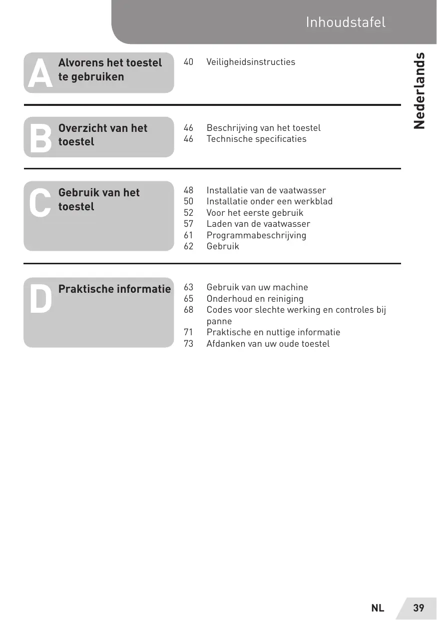 21 Chargement du lave-vaisselle 25 Description des programmes 26 Utilisation Informations 27. Mise sous tension et choix d'un programme j 29 Entretien et nettoyage ratiques Yag ee pratique: 32 Codes de dysfonctionnement et vérifications en cas de panne 35 Informations pratiques et utiles 37 Mise au rebut de votre ancien appareil