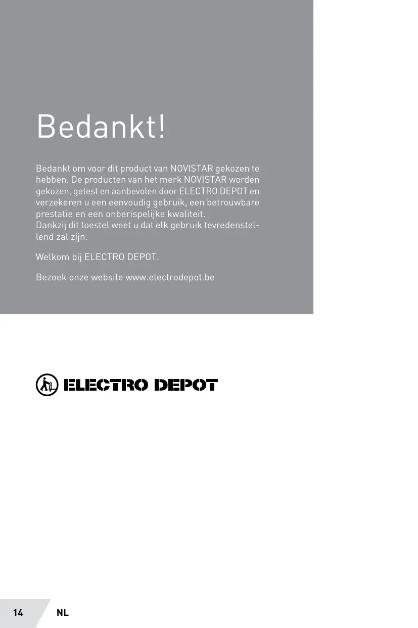Bedankt om voor dit product van NOVISTAR gekozen te hebben. De producten van het merk NOVISTAR worden gekozen, getest en aanbevolen door ELECTRO DEPOT en verzekeren u een eenvoudig gebruik, een betrouwbare prestatie en een onberispelijke kwaliteit.