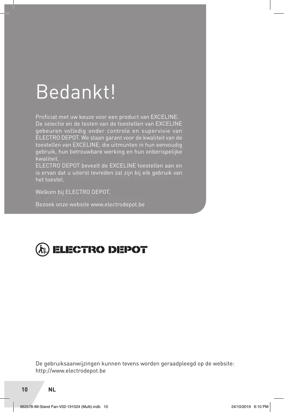 Proficiat met uw keuze voor een product van EXCELINE. De selectie en de testen van de toestellen van EXCELINE gebeuren volledig onder controle en supervisie van ELECTRO DEPOT. We staan garant voor de kwaliteit van de toestellen van EXCELINE, die uitmunten in hun eenvoudig gebruik, hun betrouwbare werking en hun onberispelijke kwaliteit.