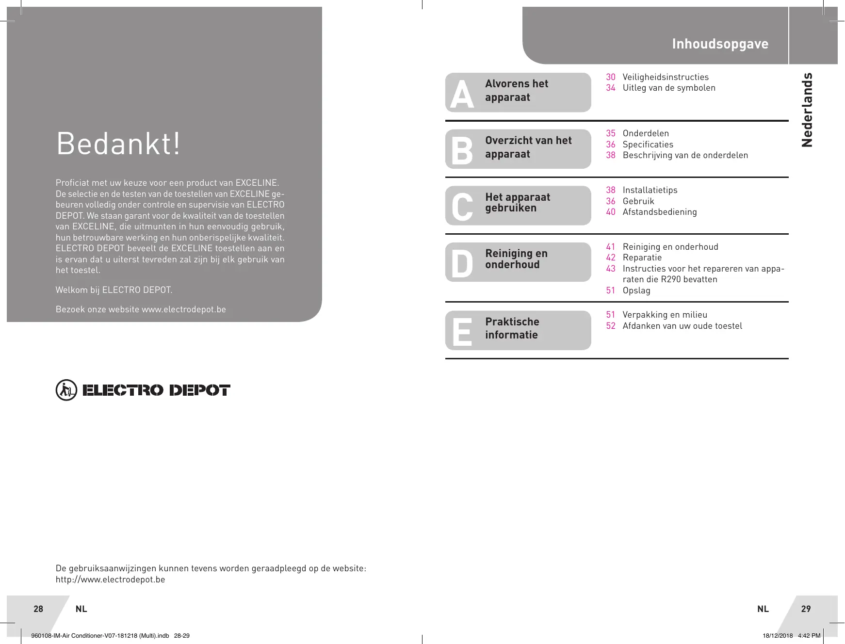 a 35 Onderdelen LQ B e d an Kkt | Overzicht van het 36 Specificaties Z Ü apparaat 38 Beschrijving van de onderdelen Proficiat met uw keuze voor een product van EXCELINE. nu De selectie en de testen van de toestellen van EXCELINE ge- Het apparaat Fe Gaanatetps beuren volledig onder controle en supervisie van ELECTRO gebruiken 36 Gebruik DEPOT. We staan garant voor de kwaliteit van de toestellen 40° Afstandsbediening van EXCELINE, die uitmunten in hun eenvoudig gebruik, hun betrouwbare werking en hun onberispelike kwaliteit — ELECTRO DEPOT beveelt de EXCELINE toestellen aan en Reiniging en 41° Reiniging en onderhoud is ervan dat u uiterst tevreden zal zijn bij elk gebruik van ÉSHELUE 12 Reparatie . het toestel. nstructies voor het repareren van appa- raten die R290 bevatten Welkom bij ELECTRO DEPOT. 51 Opslag Bezoek onze website www.electrodepot.be 51. Verpakking en milieu Praktische 52. Afdanken van uw oude toestel informatie a | — TRO DEPOT De gebruiksaanwijzingen kunnen tevens worden geraadpleegd op de website: http:/{www.electrodepot.be 28 NL NL 29 260108-IM-Air Conditioner-VO7-181218 (Multj.indb 28-29 18/2/2018 4:42 PM