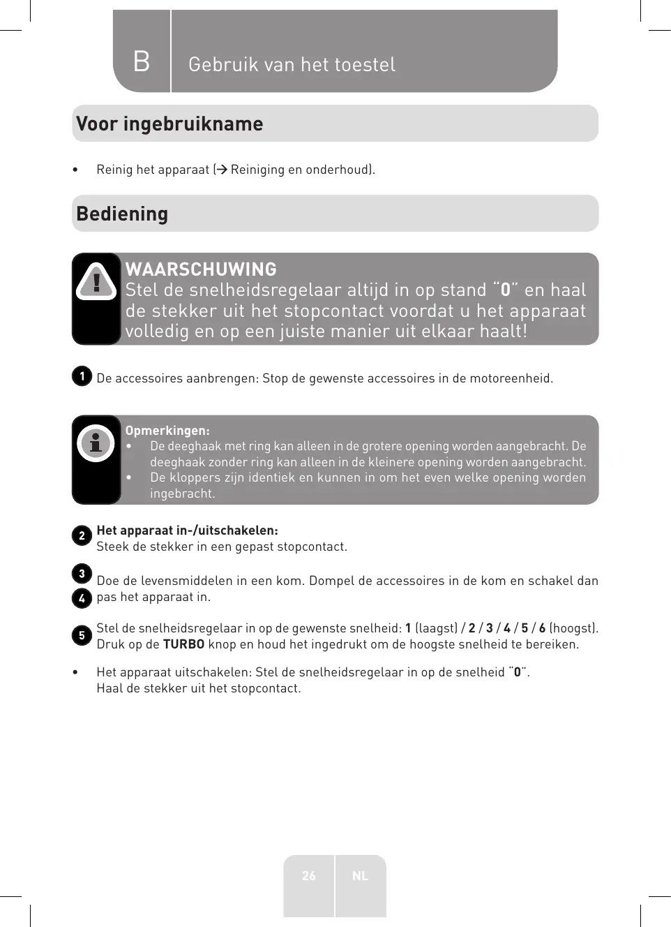 Gebruik van het toestel Voor ingebruikname + Reinig het apparaat ( Reiniging en onderhoud). Bediening WAARSCHUWING Stel de snelheidsregelaar altijd in op stand “0” en haal de stekker uit het stopcontact voordat u het apparaat volledig en op een juiste manier uit elkaar haalt! C1] De accessoires aanbrengen: Stop de gewenste accessoires in de motoreenheid. Opmerkingen: + De deeghaak met ring kan alleen in de grotere opening worden aangebracht. De deeghaak zonder ring kan alleen in de kleinere opening worden aangebracht De kloppers zijn identiek en kunnen in om het even welke opening worden ingebracht C2) Het apparaat in-/uitschakelen: Steek de stekker in een gepast stopcontact. 0 Doe de levensmiddelen in een kom. Dompel de accessoires in de kom en schakel dan C4] pas het apparaat in. 6 Stel de snelheidsregelaar in op de gewenste snelheid: 1 (laagst} /2/3/4/5 / 6 (hoogst]. Druk op de TURBO knop en houd het ingedrukt om de hoogste snelheid te bereiken. + Het apparaat uitschakelen: Stel de snelheidsregelaar in op de snelheid “0”. Haal de stekker uit het stopcontact.