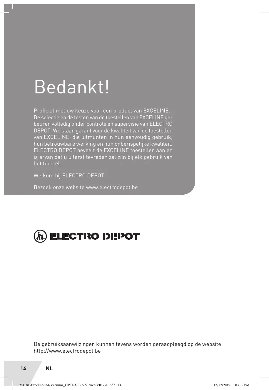 Bedankt! Proficiat met uw keuze voor een product van EXCELINE. De selectie en de testen van de toestellen van EXCELINE ge- beuren volledig onder controle en supervisie van ELECTRO DEPOT. We staan garant voor de kwaliteit van de toestellen van EXCELINE, die uitmunten in hun eenvoudig gebruik, hun betrouwbare werking en hun onberispelike kwaliteit. ELECTRO DEPOT beveelt de EXCELINE toestellen aan en is ervan dat u uiterst tevreden zal zijn bij elk gebruik van het toestel. Welkom bij ELECTRO DEPOT. Bezoek onze website www.electrodepot.be >TRO DEPOT De gebruiksaanwijzingen kunnen tevens worden geraadpleegd op de website: http:/{www.electrodepot.be 14 NL 964181-Exceline-IM-Vacuum_OPTI-XTRA Silence-VOI-3Lindb 14 13127019 50355 PM