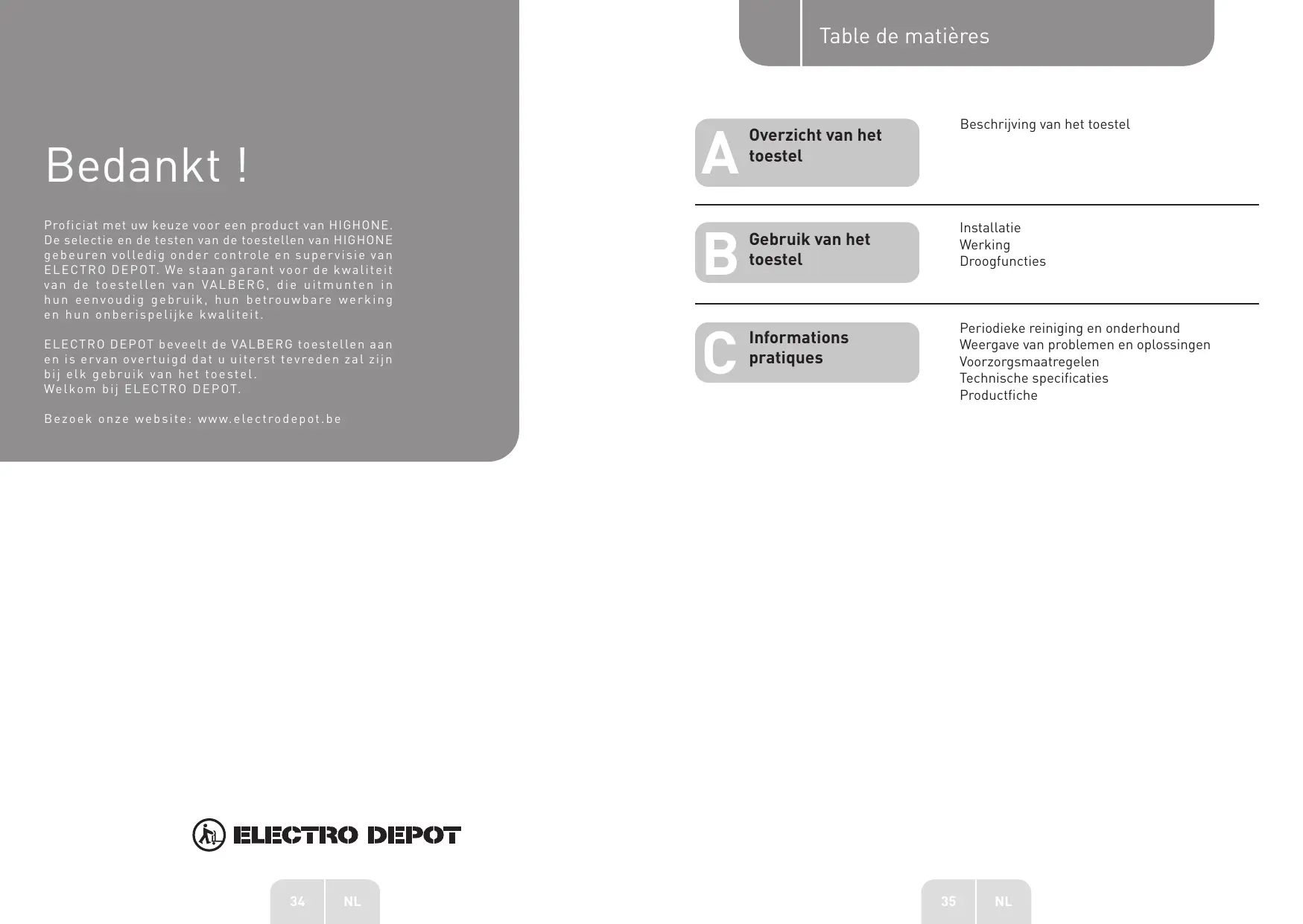 Choisis, testés et recommandés par ELECTRO DEPOT, Utilisation de Fonctionnement les produits de La marque VALBERG vous assurent l'appareil Fonctions de séchage une utilisation simple, une performance fiable et une qualité irréprochabl âce à cet appareil, vous savez que chaque uti vous apportera satisfaction. a Nettoyage et entretien périodique Bienvenue chez ELECTRO DEPOT. Informations Affichage d'un dysfonctionnement et solutions pratiques Précautions Visitez notre site Internet : www.electrodepot.fr Spécifications techniques www.electrodepot.be Fiche produit